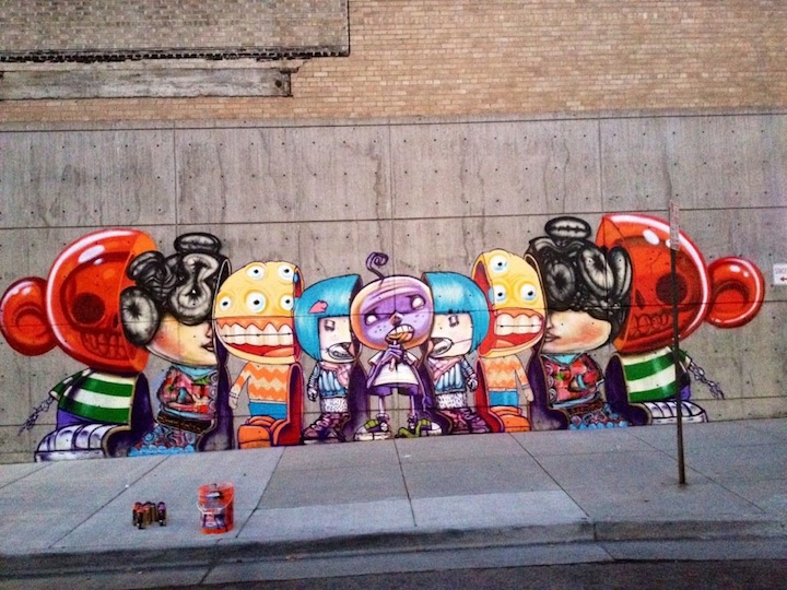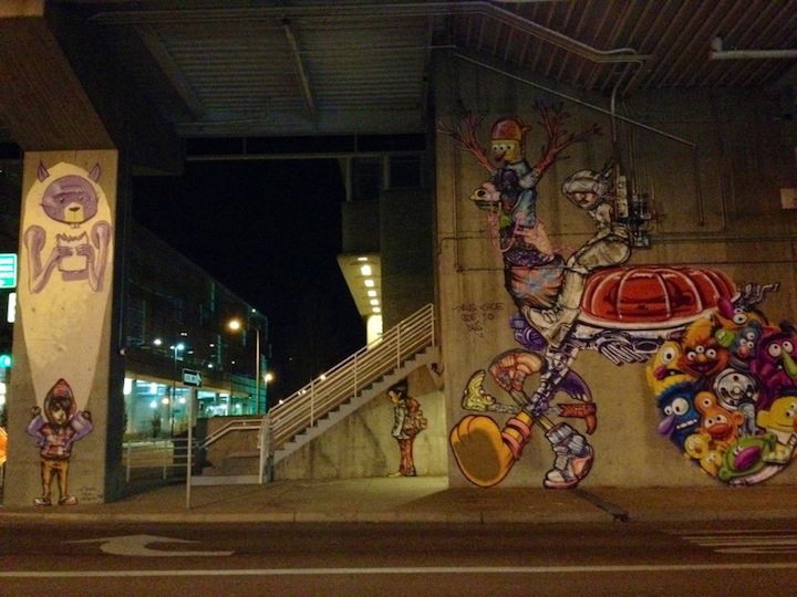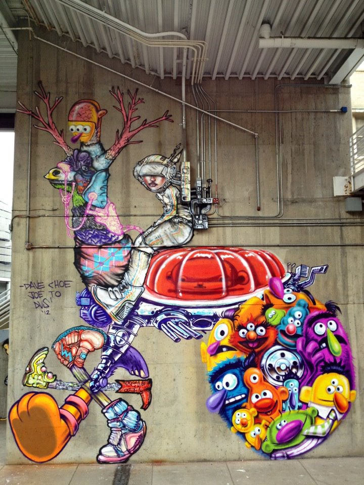 Artist David Choe hit the streets again this past week to participate in the Terminal Kings project in Denver, CO. Working with friends DVS-1 and Joseph To, crowds watched as he created these amazingly detailed, bright, and massive 8′ tall 100′ long murals. The three murals are a part of Denver International Airport's Art & Culture program.