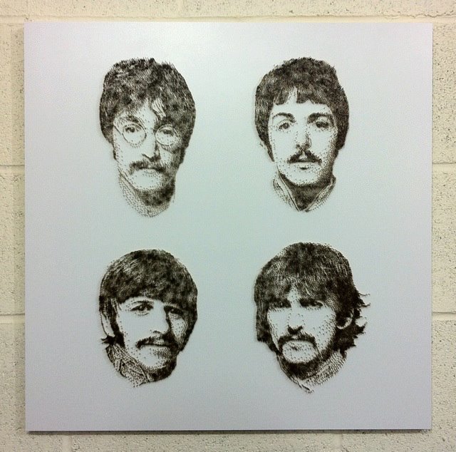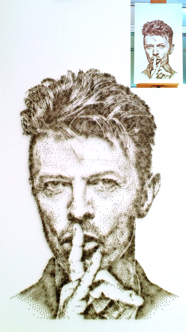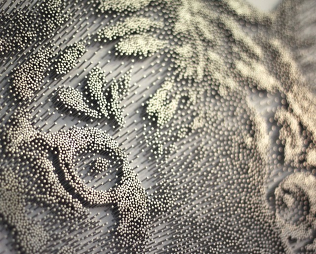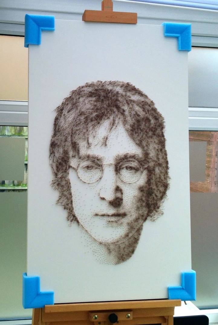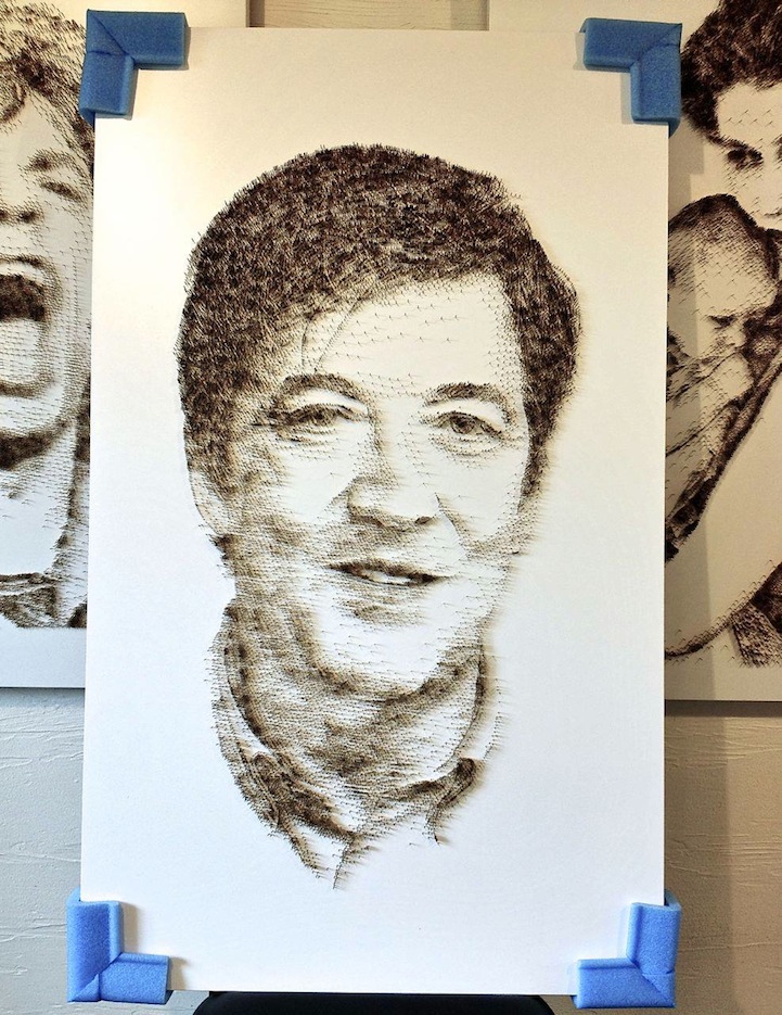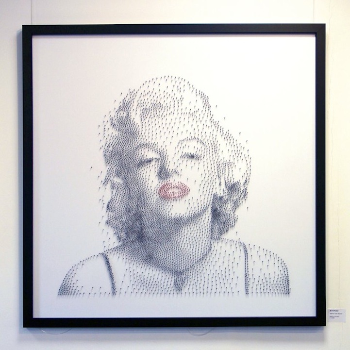 Instead of using a pen and ink, artist David Foster hammers thousands of nails onto a canvas to create these incredibly detailed portraits. Originally an architect, Foster's love for technical drawing translates perfectly into these meticulously produced arrangements. Each piece is based off of a photograph that the artist first reproduces with an ink pen. He then enlarges the drawing to use as his guide for the finished pieces.