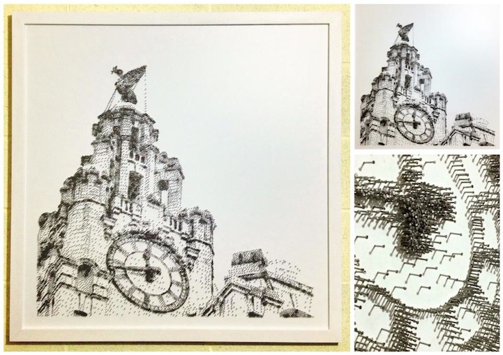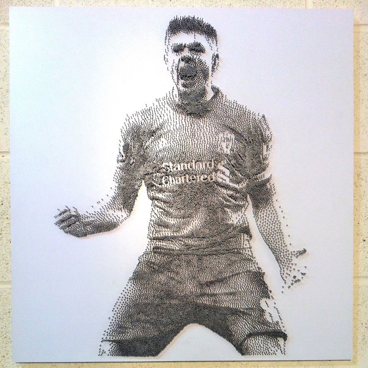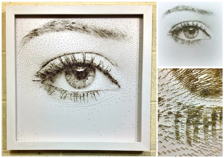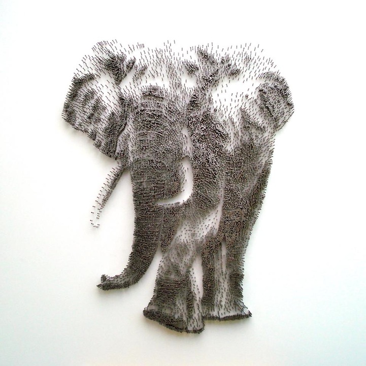 Nail head by nail head, dot by dot, the pointillist images slowly emerge as Foster builds across the canvas. His smaller drawings average only about 5,000 nails while some of the larger pieces can include as many as 30,000! The artist says, “I have always been fascinated with how little information the brain needs to interpret a picture and love the simplicity of a picture made up from just dots.”