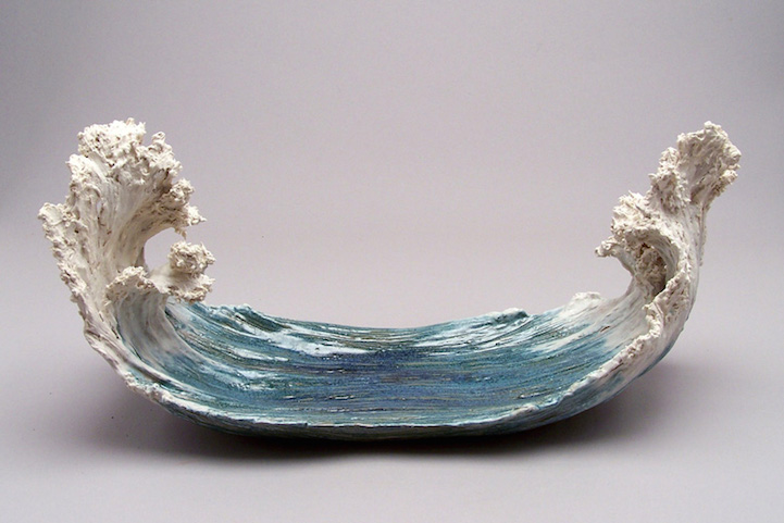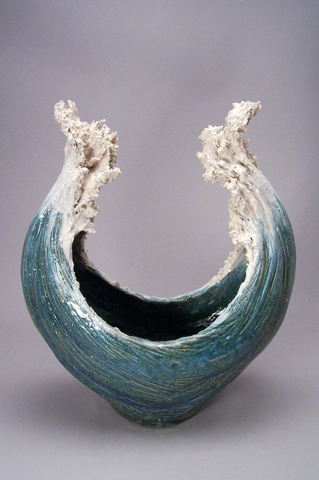 Like artists Paul DeSomma and Marsha Blaker, Denise Romecki finds inspiration for her sculptures in cresting waves. The big difference is that, while DeSomma and Blaker work with glass, Romecki creates her original pieces using stoneware clay. Requiring at least two kiln firings, her ceramic sculptures resemble beautifully rising white-capped waves that have been stunningly frozen in time.