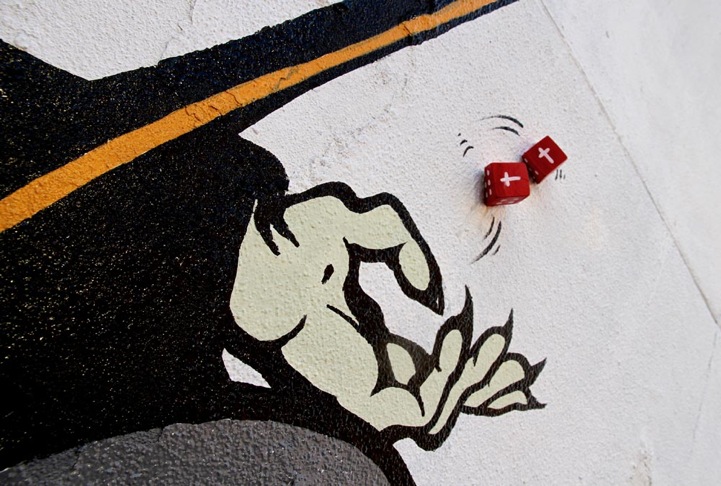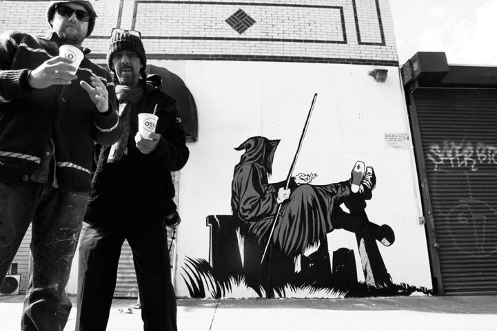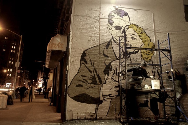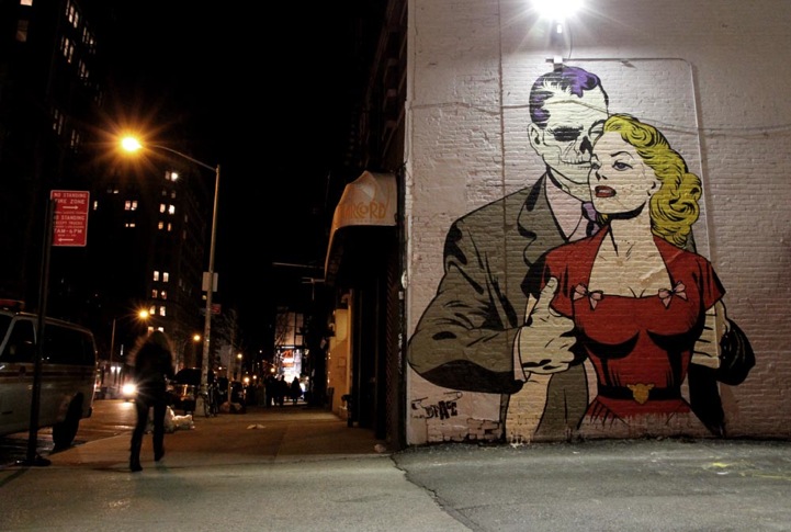 UK-based street artist D*Face has just recently made the trip to the States and transformed urban walls across New York City with his Roy Lichtenstein-inspired murals. The three public works known as Love Her, Hate Him, Handle With Care, and Grim Tales each reflect D*Face's comicbook style. In this new set of street murals, the artist recreates a character eerily similar to the skull-faced man in a suit from Beauty and the Skeletor. Rather than driving off in a fast car with a young dame, the skeletal man is affectionately clutching onto a buxom blonde, as though trying to deter her from leaving. There seems to be a running theme of despair and not wanting to let go in these three pieces. Even the Grim Reaper is tossing a pair of dice with the artist's own caption reading “Cheat death.”