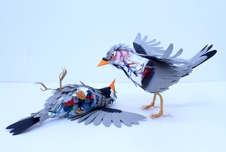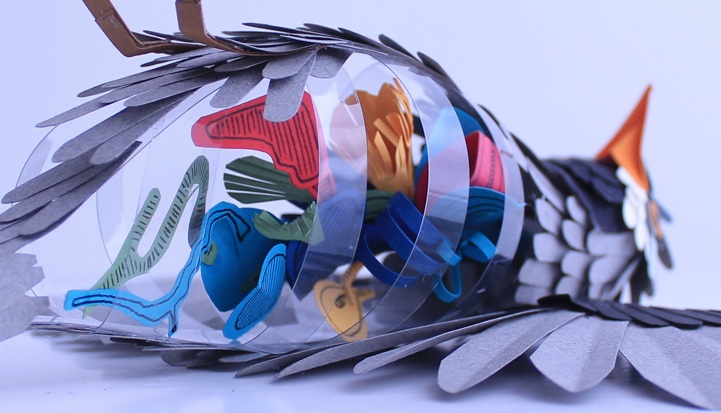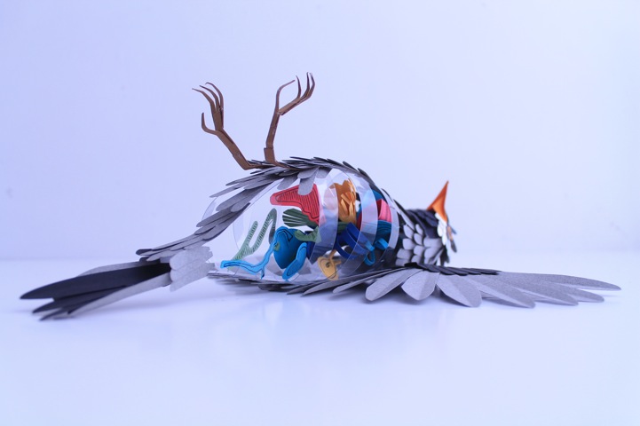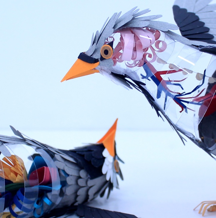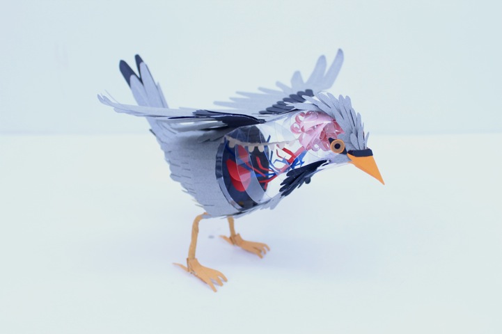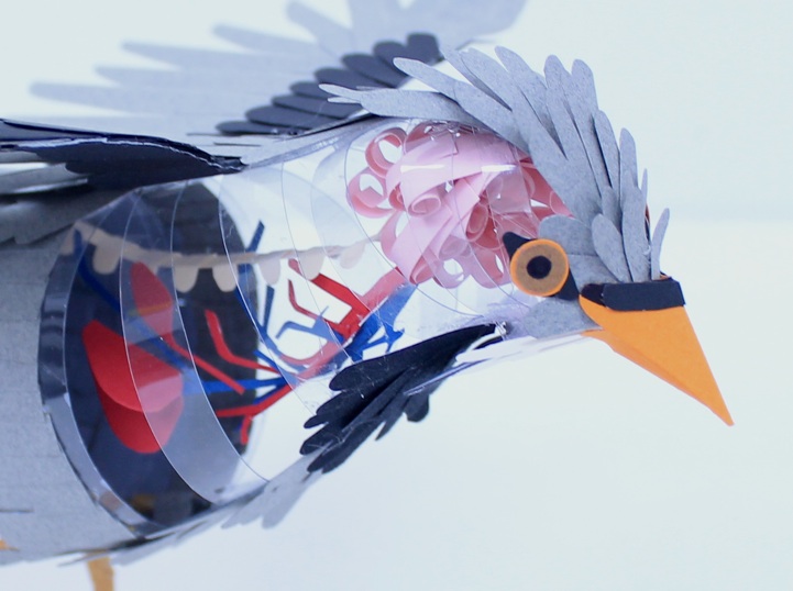 Seeing the birds' intenrnal anatomy as it is connected to the entirety of the animal is so, for lack of a better word, cool! The fascinating and aesthetically intriguing birds have a full set of colorful, hand-cut paper organs within them. With a bit of quilling, Herrera even captures the rounded, curling appearance of a pink brain. Additionally, the shiny translucent film offers an inorganic element to the sculptures that make them appear like half-bird, half-robot cyborgs. The juxtaposition of robotic and organic components work seamlessly together.