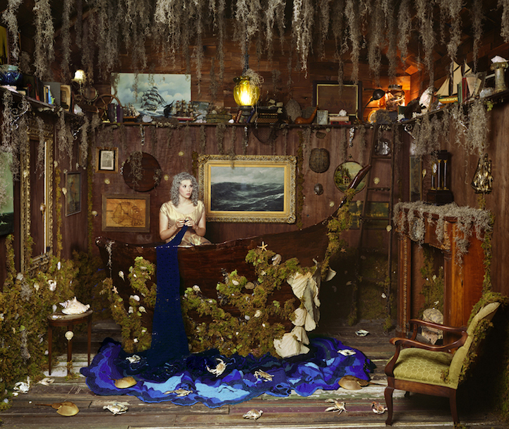 Dorothy O'Connor translates events from her life into a surreal ongoing series called Scenes. For years, the artist has transformed spaces–often a room–into fantastical places that tell a story. Visually rich and exciting, they feature elements of the natural world that are handcrafted by O'Connor. In one room, a den of snakes line a ceiling, while in another, over 200 paper birds circle the space. A giant tornado–which has over 500 feet of fabric around it–engulfs the contents of another. These awe-inspiring sights are interactive and initially displayed as installations (with live models) in galleries and other art spaces. The tornado, for instance, actually rotated during its opening.