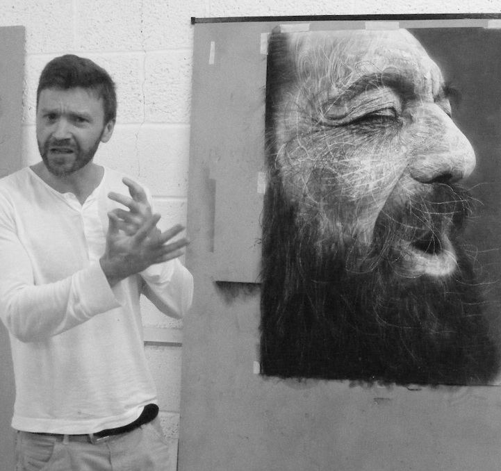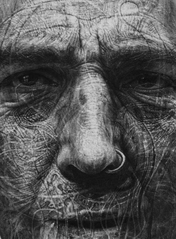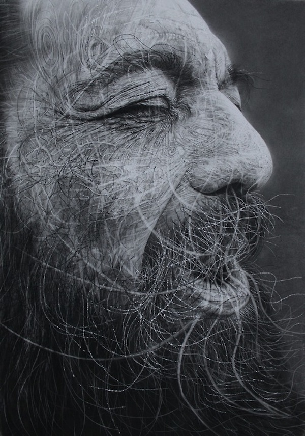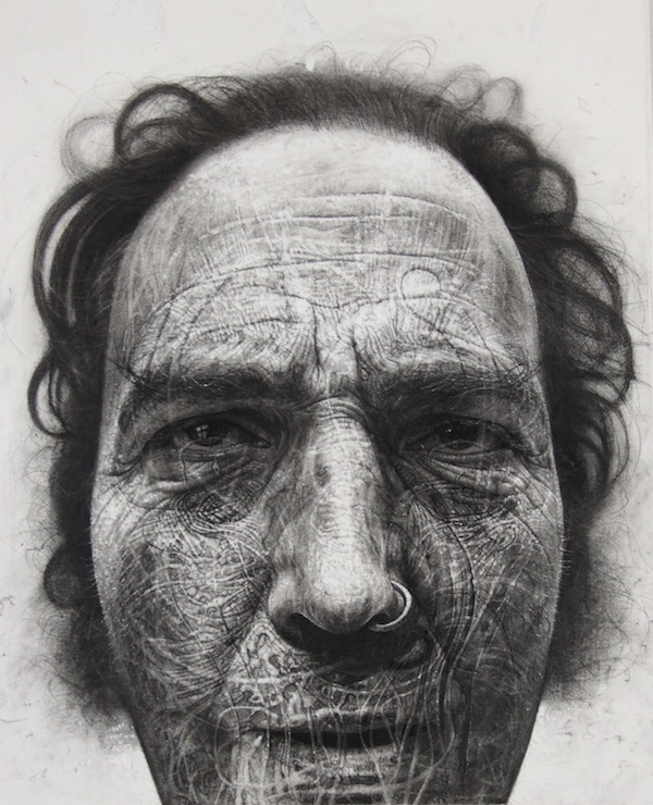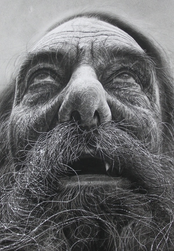 Scottish artist Douglas McDougall creates fantastically photorealistic drawings using charcoal as his primary medium but then he textures each work using scalpel blades, sharply cut erasers and coarse sandpaper. The detail to each piece is mind-blowing, especially when it comes to facial hair and weathered skin.