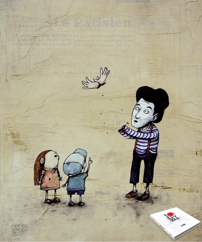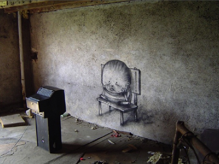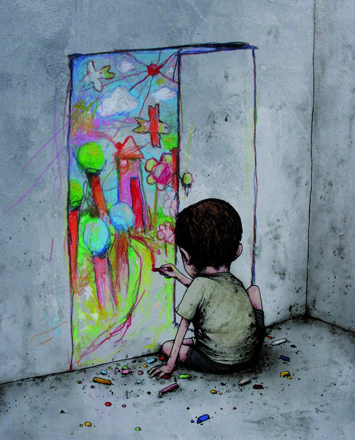 French street artist Dran uses his art to comment on issues concerning contemporary society. Being donned “the French Banksy” by some, his approach to street art is similar to the English graffiti artist in tone and message. Dran utilizes his dark sense of humor to criticize modern culture, often tackling topics concerning art, creativity, and the freedom of expression. These recurring themes in Dran's works are often depicted through children equipped with crayons.