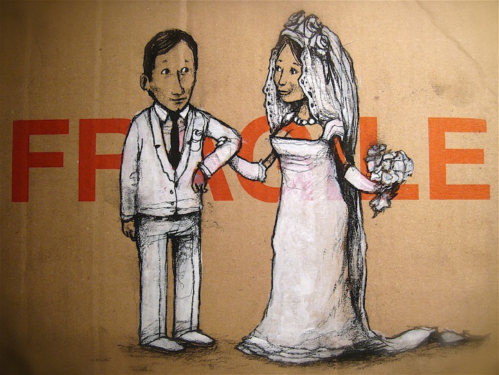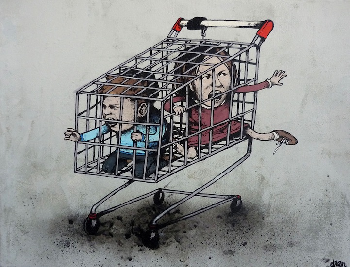 The artist brings to light the naturally imaginative mind of children while questioning the suppression and imprisonment of such creativity. Dran also criticizes social issues including the modern era's rise in failed marriages, the inability of couples to connect to one another despite sharing an intimate bed, environmental destruction paving the way for more condos, overconsumption and waste. Each hard-hitting issue is presented in its own whimsical manner while retaining its heavy message. Dran is definitely an urban artist to keep your eyes on!