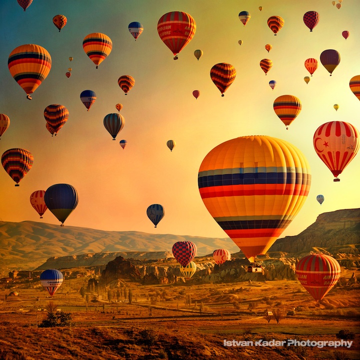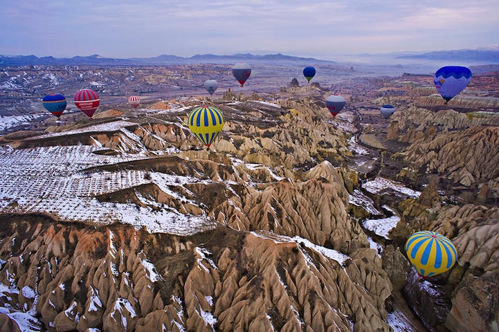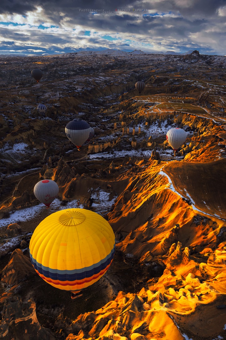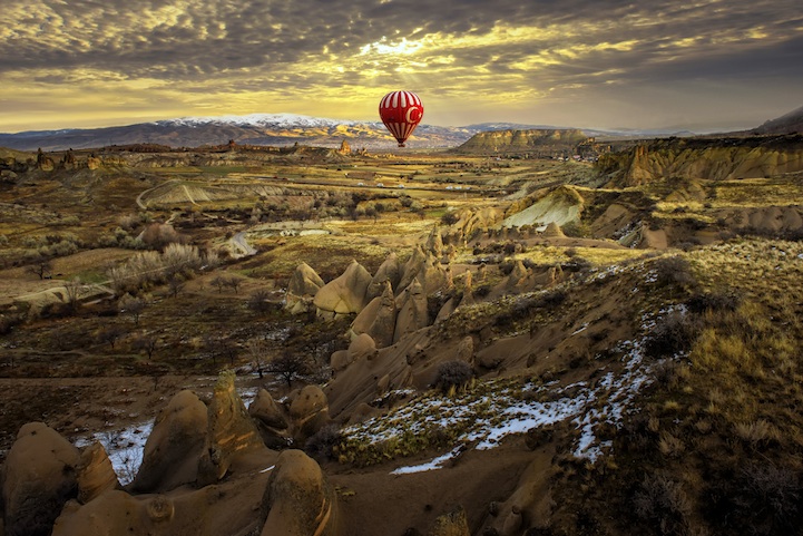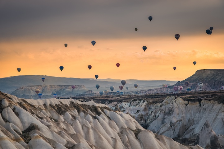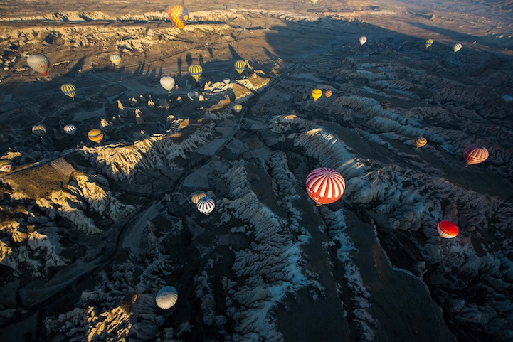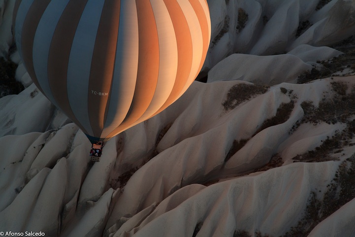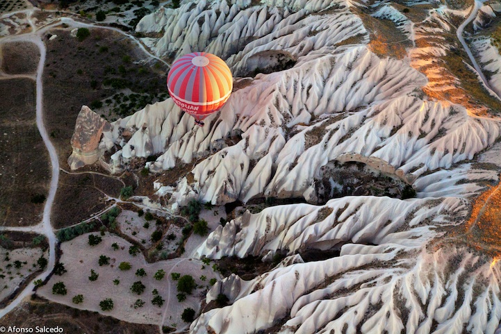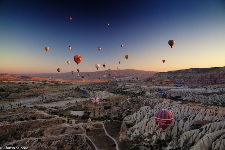 Photographer Afonso Salcedo describes it like this, “When the sky fills up with hot air balloons rising slowly in unison with the Sun. What a treat. The silence of the air, the chimneys, rocks and caves under you.” Bucket list!