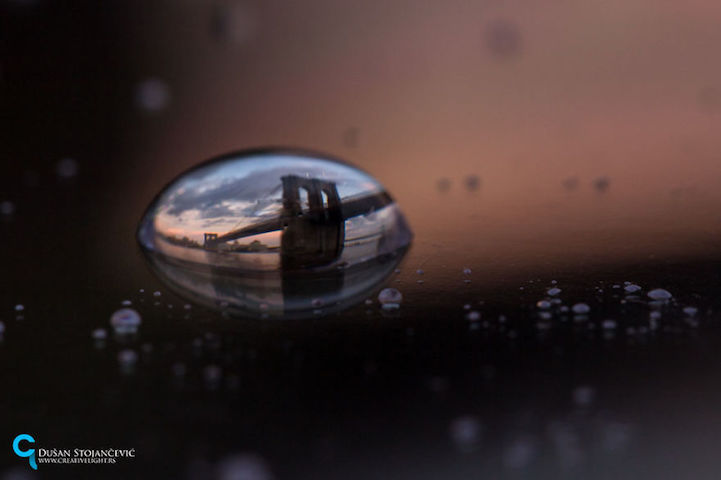 Photographer Dusan Stojancevic depicts metropolises contained within tiny droplets of rainwater. For the past 15 years, he has revealed minuscule cityscapes that hide in the beads of liquid. Towering buildings, expansive bridges, and glittering lights are reflected in the tiny dots sitting on metallic surfaces. They’re visually divorced from the actual piece of architecture they’re echoing and instead offer a surreal look into seemingly alien worlds.
