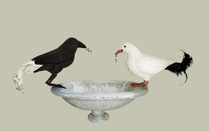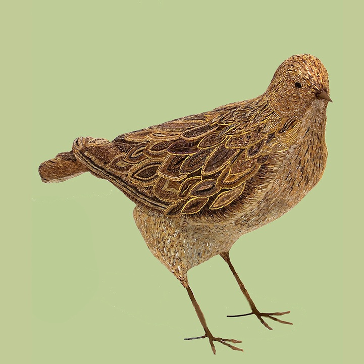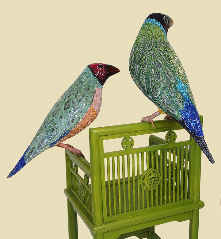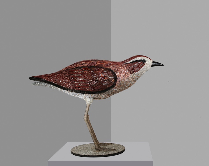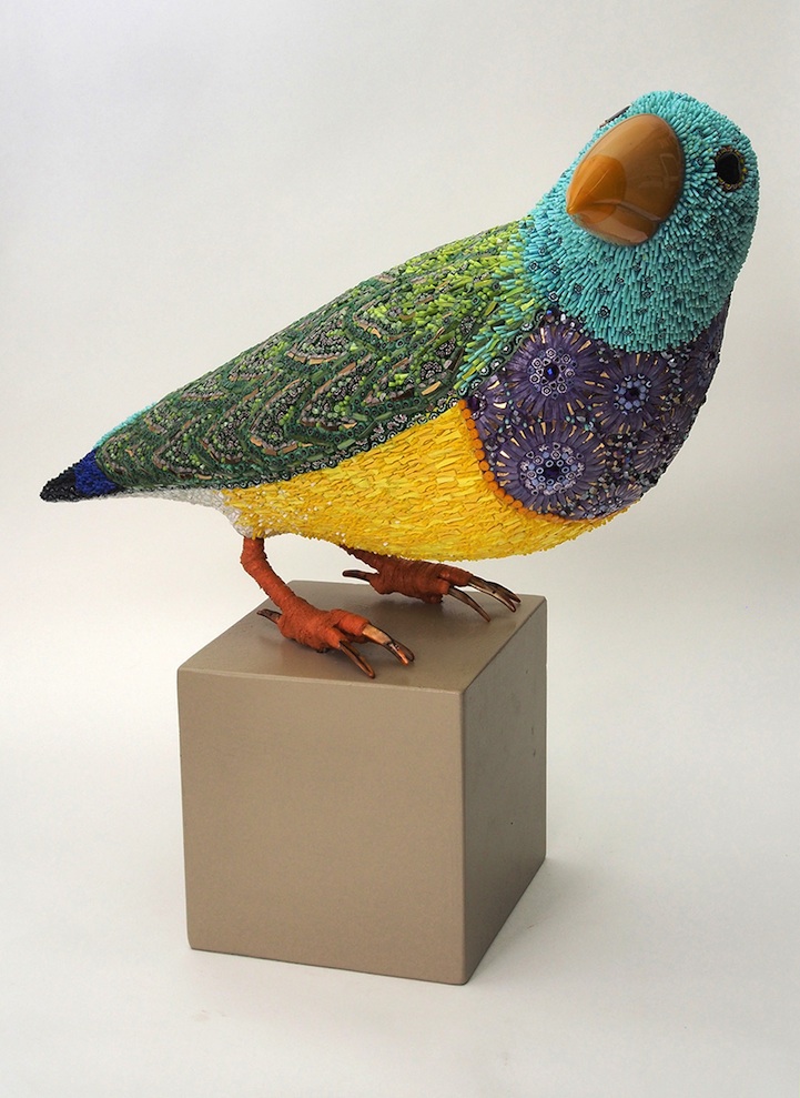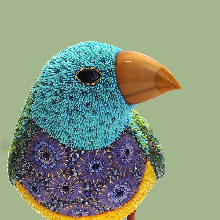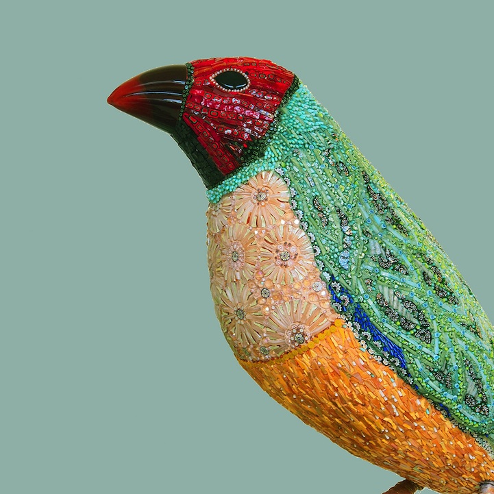 Venice, Italy-born Dusciana Bravura is the artist behind these breathtaking bird sculptures made of mosaics. Her works like Yellow Beak, pictured above and immediately below, is made out of a mixture of glass paste, millefiori, crystals, iron, cementitious adhesive on fiberglass structure. Its beak is composed of Murano glass. Though from farther away one can appreciate the beautiful structure, come up close and you'll be blown away by all the detailed work that goes into creating each piece.