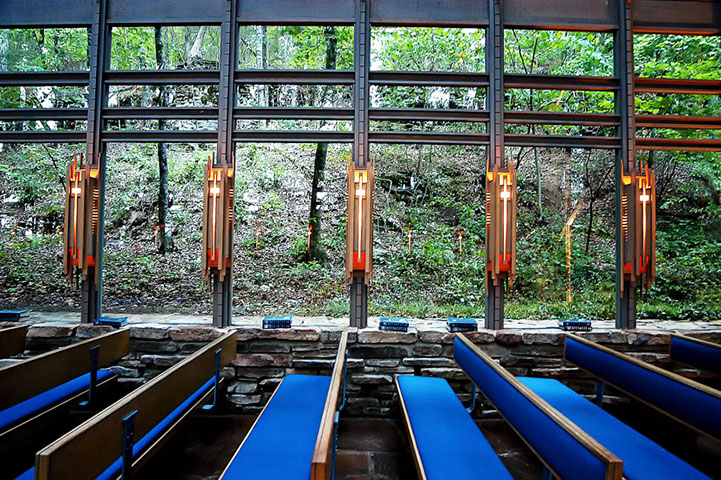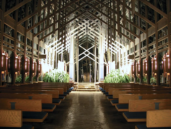 As a result of his work as an apprentice to Frank Lloyd Wright, Jones had an equally strong eye for designing structures that stand in harmony with the environment. The Thorncrown Chapel is a 48-feet tall wooden construction with over 6,000 square feet of glass and 425 windows that allow sunlight to shine through the windows from every angle. The architecturally intriguing space has been visited by more than six million people and is described as a “woodland sanctuary,” providing a peaceful place to rest and enjoy a few quiet moments of self-reflection.