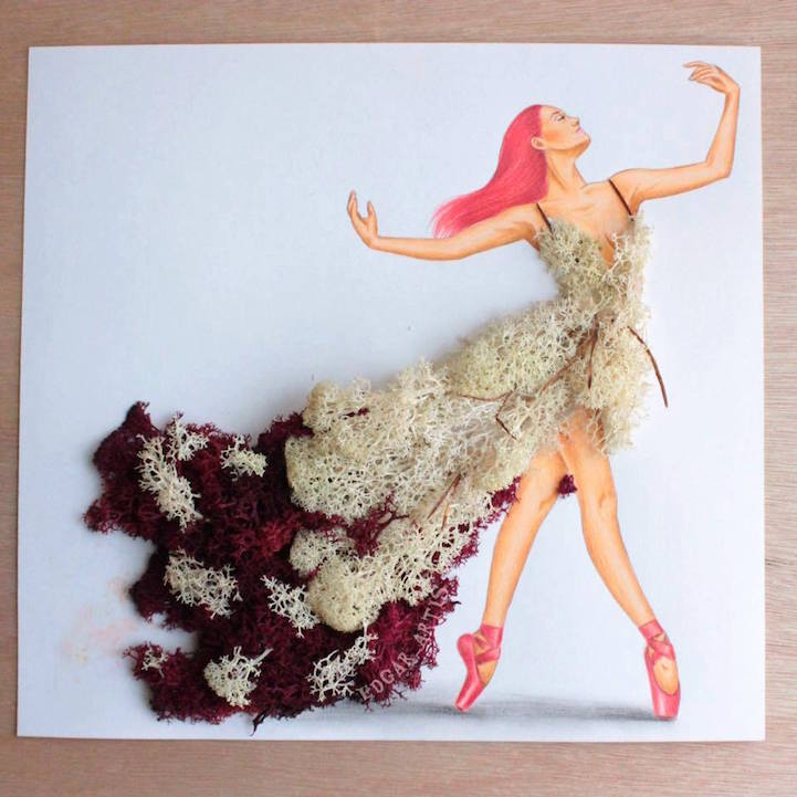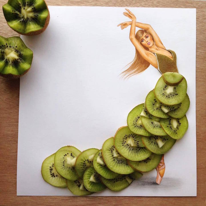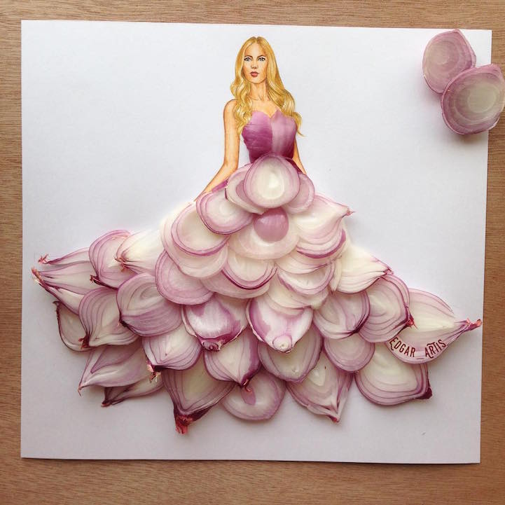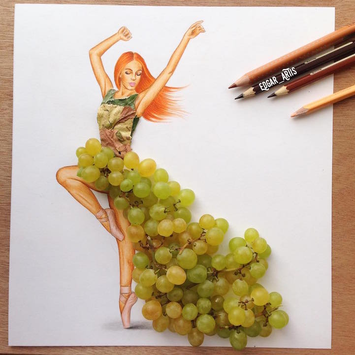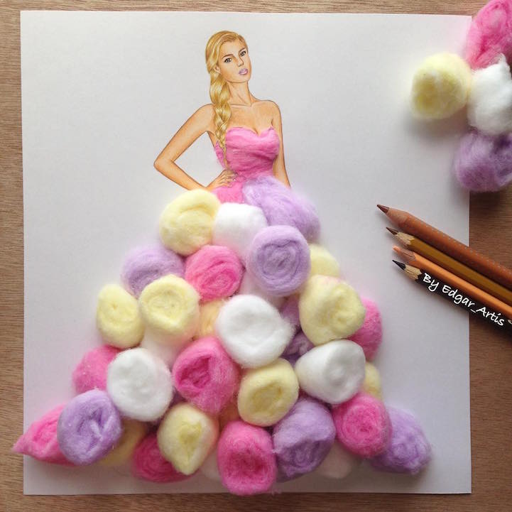 It takes serious out-of-the-box thinking to take common household foods, such as string beans and Oreos, from the cupboard to the canvas. Luckily, the creative eye of illustrator Edgar Artis sees the world differently. The artist, whose work first caught our attention earlier this year, has continued to expand his sketch collection of unconventional evening gowns. Using real-life objects as dress material—including gummy bears, seashells, kiwis, and cotton balls—he creates surprising object transformations that seamlessly blend with fashion illustrations into playful three-dimensional visions that would make any fashion lover envious.