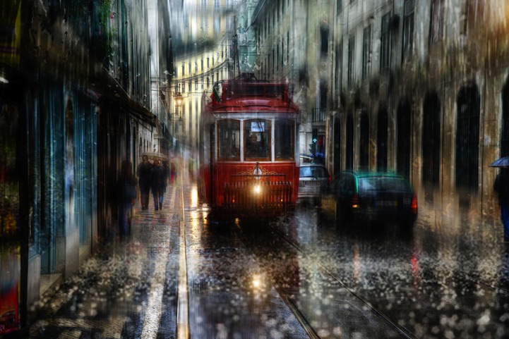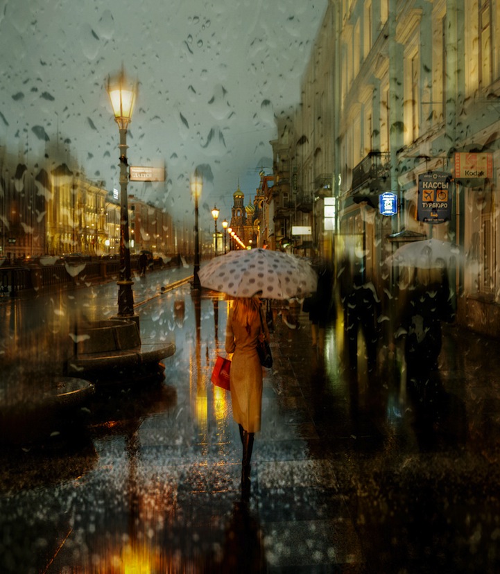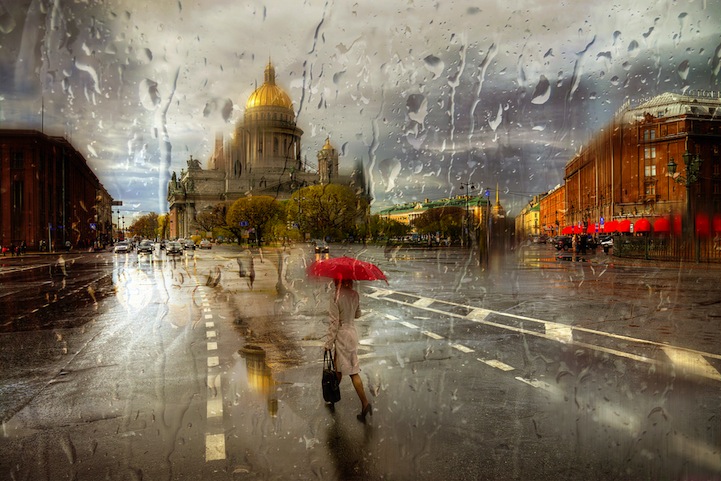 Eduard Gordeev's cityscape scenes distinctly capture the moody ambiance of dark skies and rain-soaked streets. The St. Petersburg-based photographer often features widely recognized Russian landmarks viewed through windowpanes as raindrops streak down the glass. As the rain smears colors and diffuses light, the photos nearly take on the quality of impressionist oil paintings.