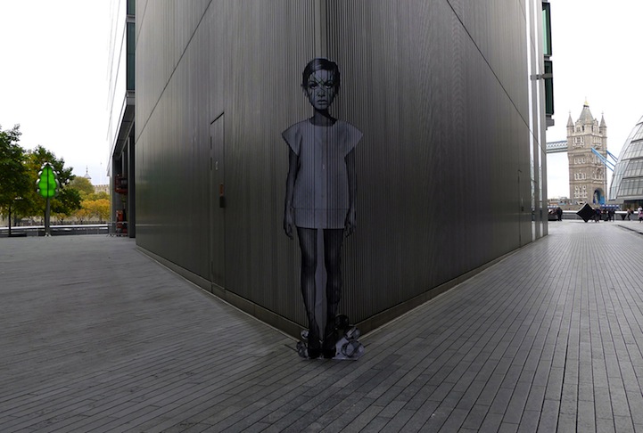 Artist Miss Bugs has created some fascinating new cut out prints as part of her “Cut Out + Fade Out” series found in London. The images seem to eerily emerge from the environment they've been placed into and blend in well with the background, meeting up with specific lines and colors. When seen in the studio before their installation, the pieces look unfinished. It becomes clear that the environment drastically compliments these pieces. Miss Bugs has other series of works that can be found on her website.