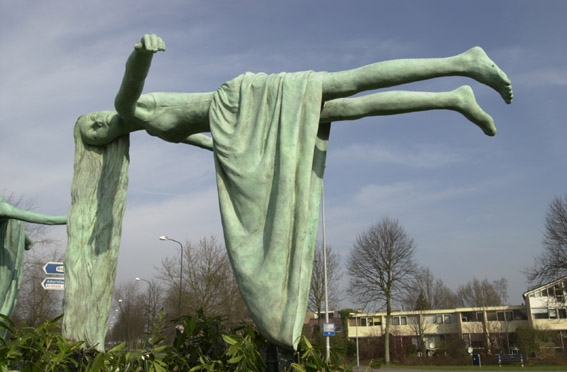 The Virgins of Apeldoorn is a public installation in the Netherlands by Dutch artist Elisabet Stienstra. The sculptural work features three bronze statues of girls in varying positions, all seeming to lie parallel to the ground. Their hair and the cloth of their dress hangs below them as though they are sleeping on an invisible bed in midair. The intriguing figurative pieces are each presented in an almost cyclical composition. One cannot tell if these are three separate girls or perhaps the same one at different periods of time, tossing and turning in bed.