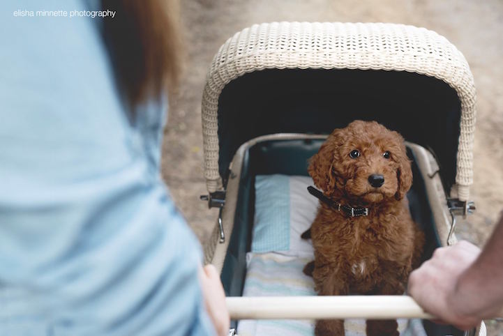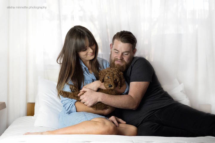 A common question often posed towards couples is, “So, when are you having kids?” While it can be an irritating inquiry, one couple found a hilarious way to deflect the issue. Matt Kay and Abby Lee staged a very special photo shoot–the kind you see from newborn parents–only instead of a little human, their “new addition” was their sweet baby puppy, Humphry.