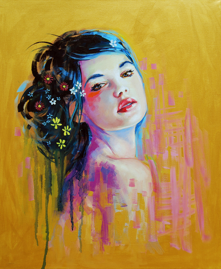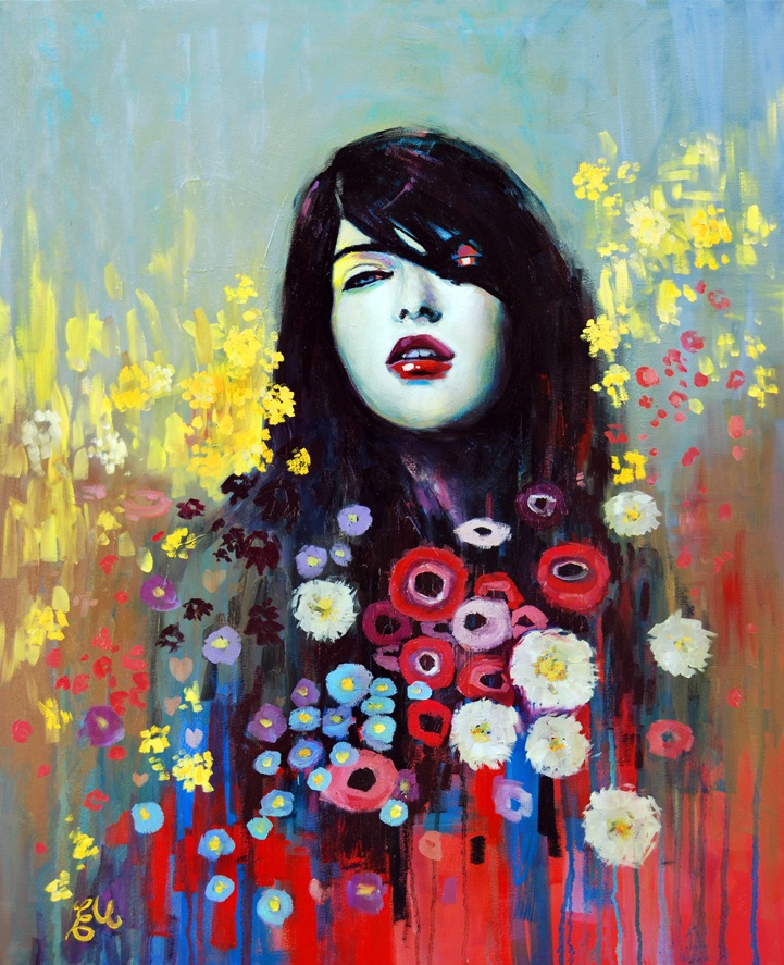 Artist Emma Uber has an incredible knack for paintings faces. Her series of pastel portraits involves beautifully detailed–and mainly feminine–faces that blend into backgrounds filled with thick, vibrant strokes, drips and smears of paint, and bursts of colorful shapes and flowers. Her use of a strong color palette and aggressive strokes, set against the soft features and expressionless faces, sparks an intense curiosity about each of her subjects.