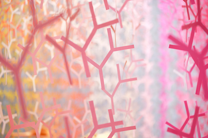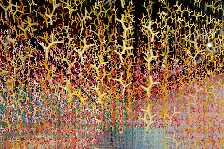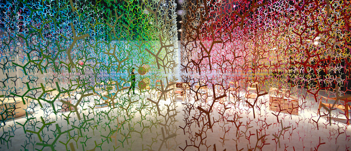Artist Emmanuelle Moureaux has filled an exhibition hall with 100 shades of colors to create an ethereal, airy feel in the large space. This stunning display was created for the presentation of the Wood Furniture Japan Award 2016 in Tokyo. Small branches dangle from the ceiling, dazzling us as a multitude of hues intertwine and form waves of color around tables and chairs.