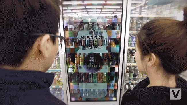 TransLook technology is also used in refrigerators that have already started popping up in convenience stores around South Korea. Striking, high-quality digital art splashes across the glass door of a fridge, immediately grabbing the attention of nearby customers.