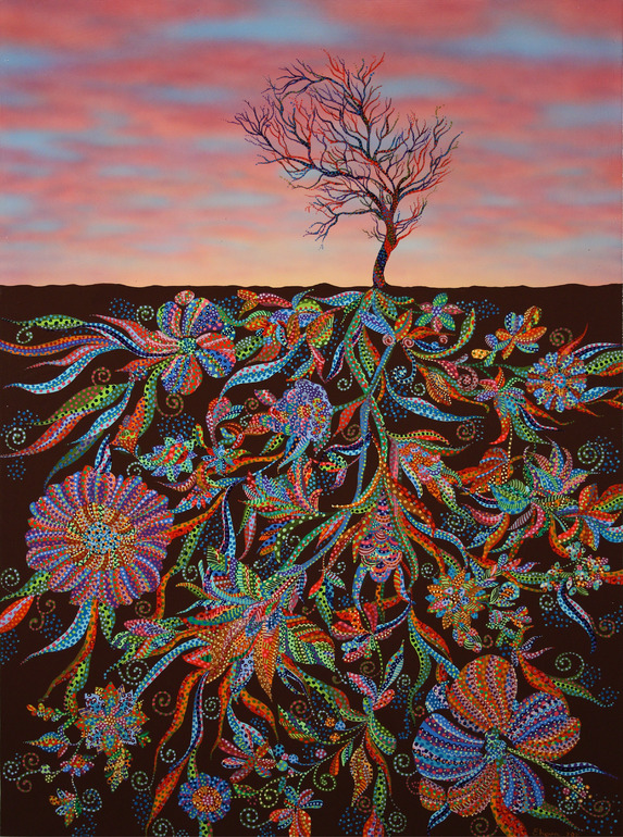 Hidden beneath the soil, Pochybova-Johnson depicts an effervescent root party. It is a complementing contrast to the barren tree that sits atop the dirt. It is an unexpected surge of energy that offers an interpretive idea of one's vibrant spirit encased in a seemingly dull shell. The artist's eye-catching paintings make one rethink about judging a book by its cover or, more aptly, a tree by its branches.