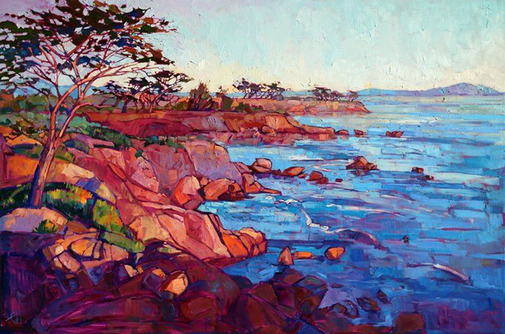 Through her work, she transforms the beauty of the real world into magical landscapes using bold colors and thick brushstrokes. Hanson calls her style open-impressionism, explaining that “open impressionistic painting is blind to the rules of traditional impressionism, taking a more colorist, ‘open' approach, with the artist attempting to soak in the basic abstract shapes of the landscape on a more primal level.”