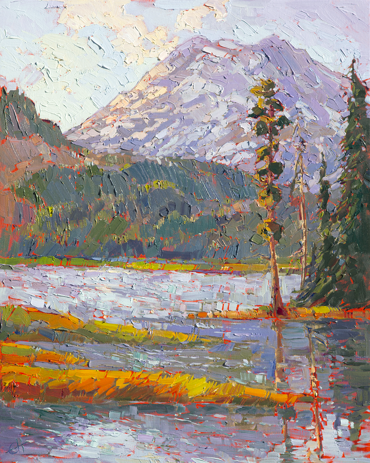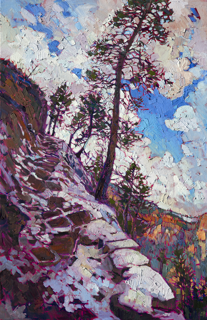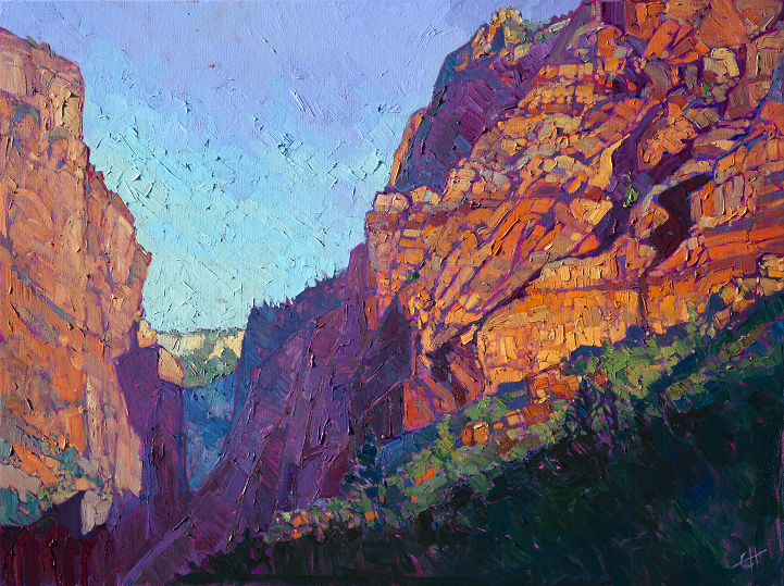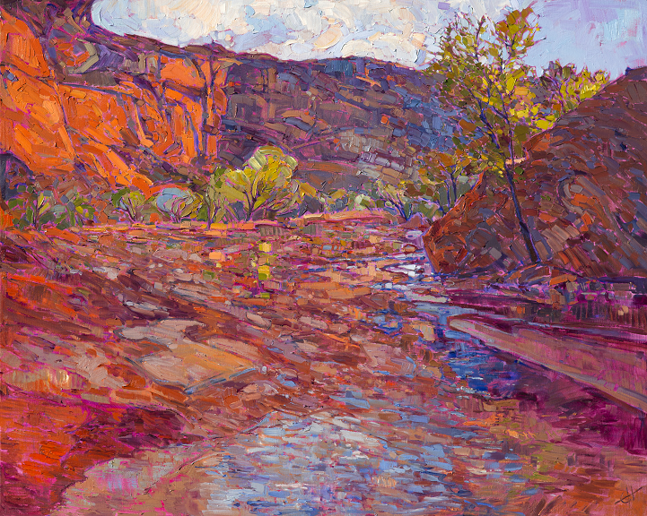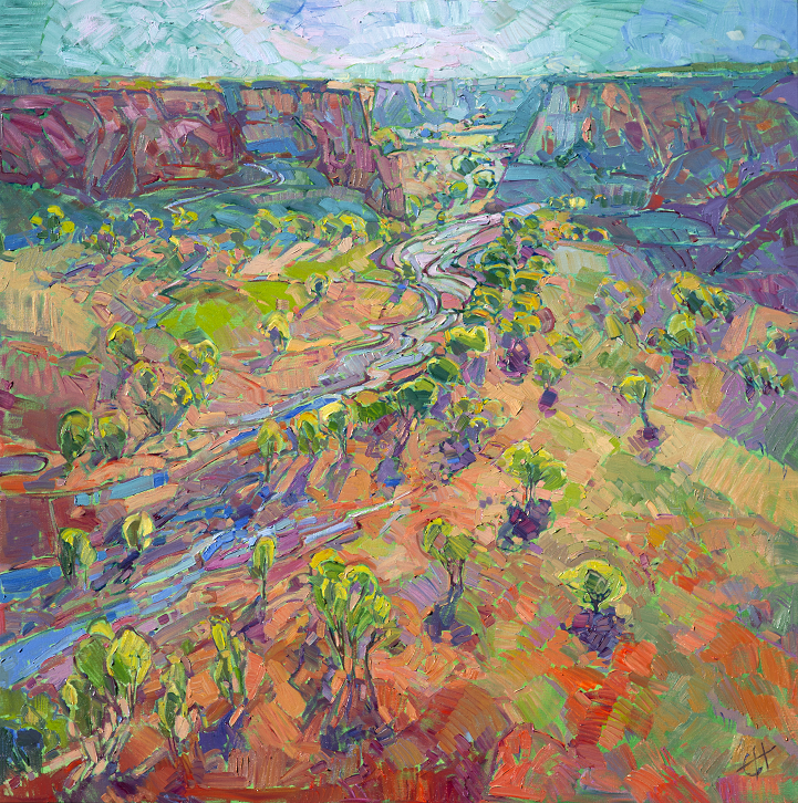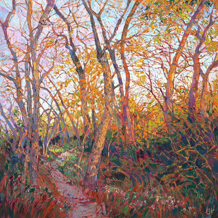 The artist, who has been voraciously honing her painting skills since she was just ten years old, celebrates the amazing beauty of the outdoors within her artwork. Weaving saturated hues into her paintings, Hanson transports her viewers to the magic golden hour that can only be found at sunset or sunrise. Gathering thousands of photographs during her trips to National Parks around the country, she then transmits these moments onto canvas upon her return, instilling a characteristic open-impressionistic style into each colorful creation. The pioneer of this minimalistic technique which places impasto paint strokes without layering, Hanson creates pieces that are reminiscent of famous impressionists such as Monet, but remain entirely of her own perceptions.