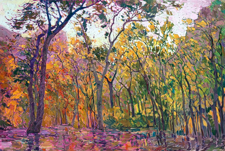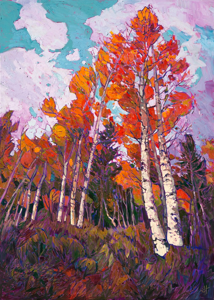 Intense shades of red, deep purple hues, fiery oranges, and splashes of bright green combine to form Erin Hanson’s soothing landscape paintings. The young contemporary pairs exceptional multi-hued skyscapes with leaning trees and imposing mountain faces to impart her own unique impressionist take on the picturesque settings. Armed with a paintbrush, Hanson forms “abstract mosaics of color and texture” that convey a mastery of shades, tints, and tones.