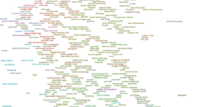 Every Noise at Once was created using data that's tracked and analyzed by The Echo Nest. To produce this massive list, it uses an algorithmically-generated, readability-adjusted scatter-plot of the musical genre-space. After compiling these categories, they were arranged into a cloud-like map. As you scroll down the page, different types of music flow into one another, their link colors shifting from a lilac purple to blue-green hues. This helps to comprehend the different genres, as does the size of text. General, less distinct categories like “classic rock” appear larger, while the more nuanced subgenres are smaller.