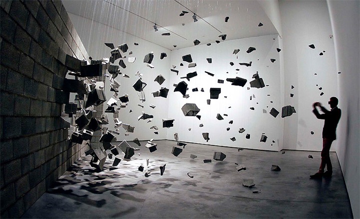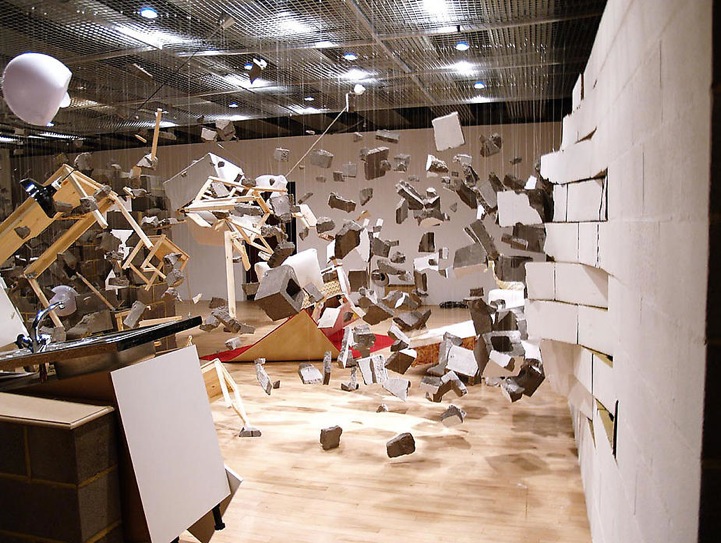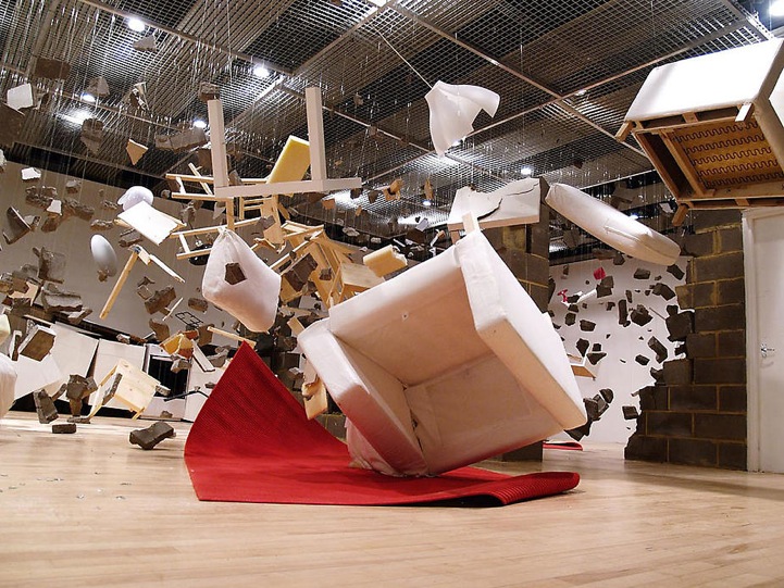 What does an exploding room actually look like? Havana-based artists Dagoberto Rodriguez and Marco Castillo, collaboratively known as Los Carpinteros, have constructed an installation depicting a room amidst an explosion. The imaginary blast rips through walls and furniture, leaving broken sculptures and debris suspended in the air. It's as if time has stood still. Spectators of the exhibit are given the unique opportunity to view the effects and damage of an exploding room from all angles.
