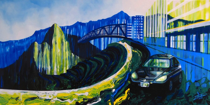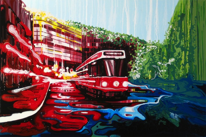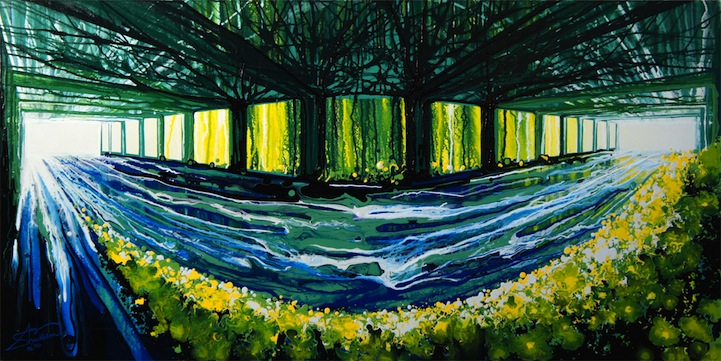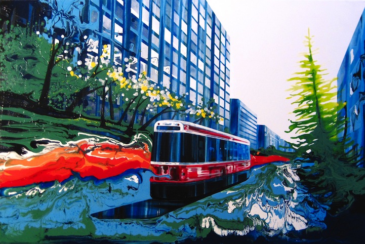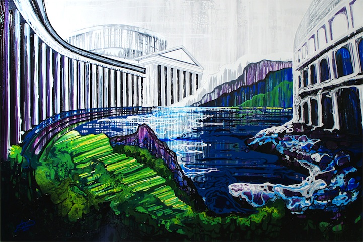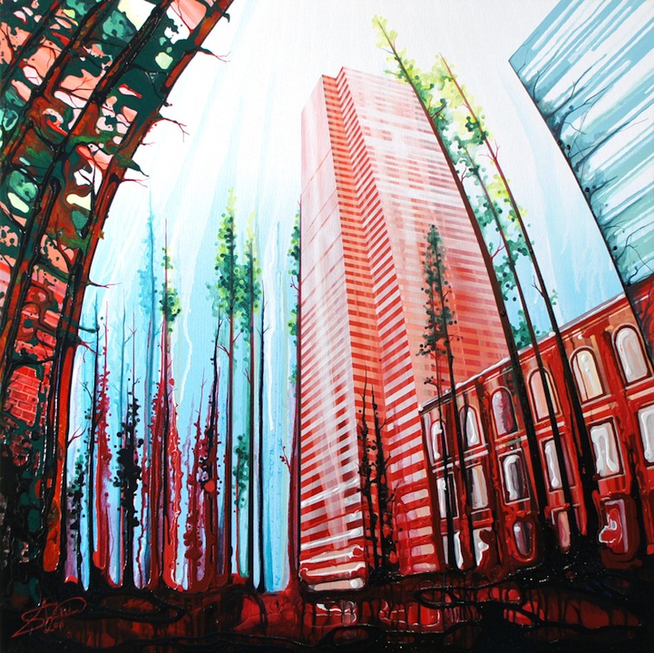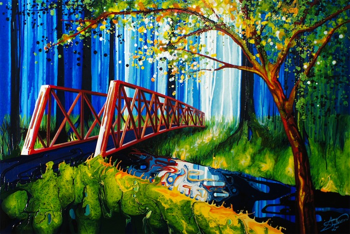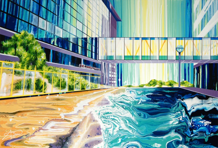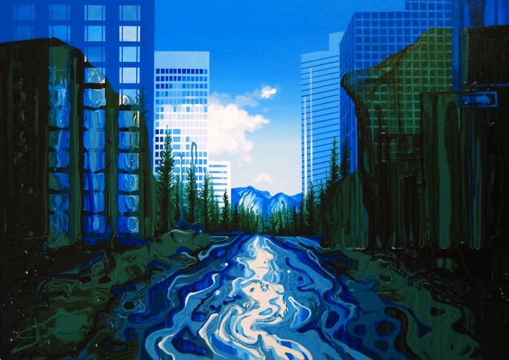 Amy Shackleton, who is only 25-years-old, is a unique artist. While her paintings use tons and tons of paint, she doesn't use paintbrushes to create them! Rather, she squeezes paint onto canvases and then allows the paint to naturally drip. She then rotates the canvas to control the direction of the drips, making her paintings appear natural yet controlled.The subjects of many of her paintings are also quite interesting. They often feature a blend of the natural world and the man-made world, such as a river in the streets, trees growing with skyscrapers and cities in mountainous ranges.