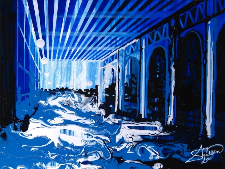I worked on unstretched canvas at first, so the surface was flexible and I could move it whichever way I wanted. And that worked pretty well. But when I became more experienced with my technique, I abandoned my brush completely and started dripping concrete forms and more straightedge details on a stretched canvas. It was more exciting and fun to challenge myself to work with gravity alone. It's interesting to look back at the last three years, because with every piece, I used fewer and fewer brushes and then finally, only drips. So it was a process.