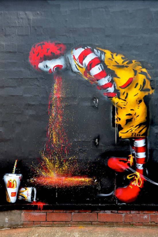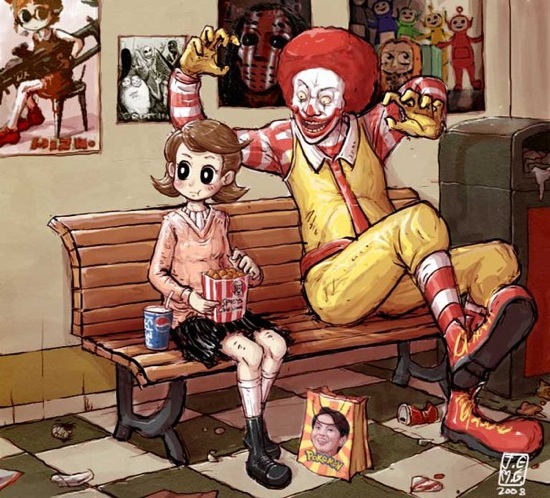 What in God's name was McDonald's thinking when they made their mascot a freaky looking clown? Perhaps they wanted to scare kids into giving them their lunch money. Putting together this list of the most disturbing Ronald McDonald art on the web, we learn a few things about this unwieldy character. Not only does he have a problem holding anything down, this guy's got a major beef with his competitors!
