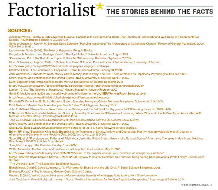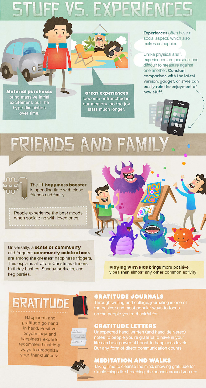 Happiness is something that many of us strive for, but might have a hard time finding. While this feeling is partially determined by our genetic makeup, there are also steps we can take to actively foster joy. The website Factorialist, which “pairs science with story,” created a helpful guide to becoming happy. By combining scientific studies and charming illustrations, they present a comprehensive look at the ways in which we can improve our overall contentment.