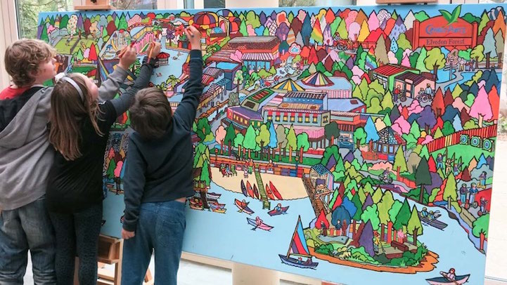 Fancy Features produces illustrations that are completely customizable based on their special occasion. The company has worked with the likes of charities, large corporations, schools, and weddings, creating more than 100 one-of-a-kind coloring canvases. To do this, they work with their clients on ideas for content. “You can ask me to put anything you like into your picture,” Leyden explains. She then drafts a design, gets its approval from the client, and illustrates it as big as the person or organization wants. The addition of specific people, places, and architecture means that these massive pictures are not only entertaining, but conceptually meaningful, too.