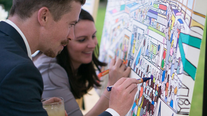 Fancy Features produces illustrations that are completely customizable based on their special occasion. The company has worked with the likes of charities, large corporations, schools, and weddings, creating more than 100 one-of-a-kind coloring canvases. To do this, they work with their clients on ideas for content. “You can ask me to put anything you like into your picture,” Leyden explains. She then drafts a design, gets its approval from the client, and illustrates it as big as the person or organization wants. The addition of specific people, places, and architecture means that these massive pictures are not only entertaining, but conceptually meaningful, too.
