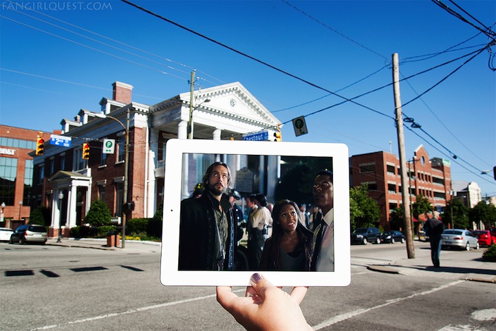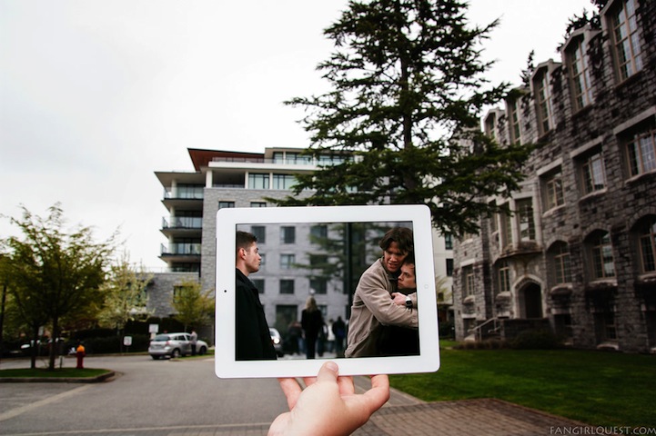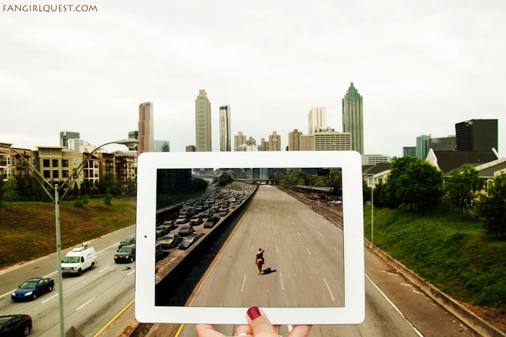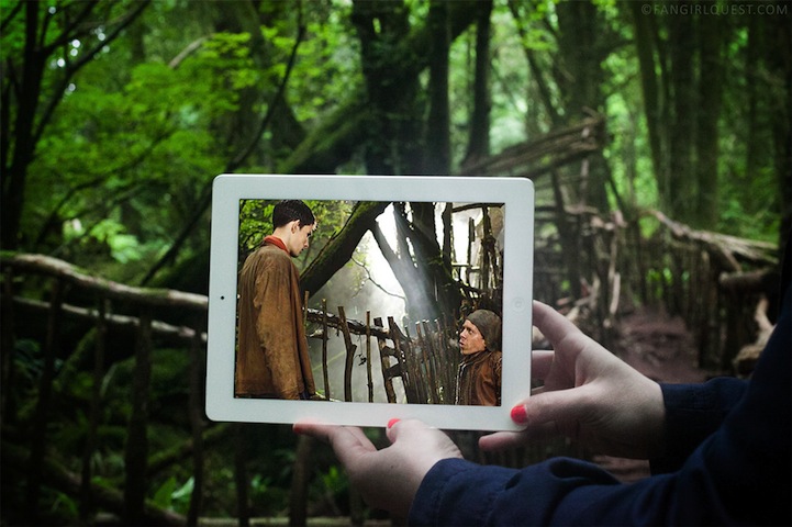 Using an iPad, hman and Walden superimpose still shots from popular shows (e.g. Game of Thrones, Breaking Bad, The Walking Dead, etc.) and beloved movies (e.g. Forrest Gump, The Avengers, Batman Begins, etc.) over the real locations they were originally filmed on, aligning every piece of architecture and shrub within their device with the outside world.