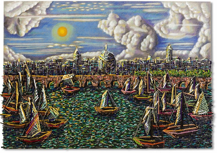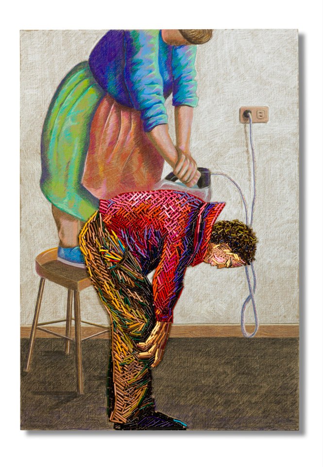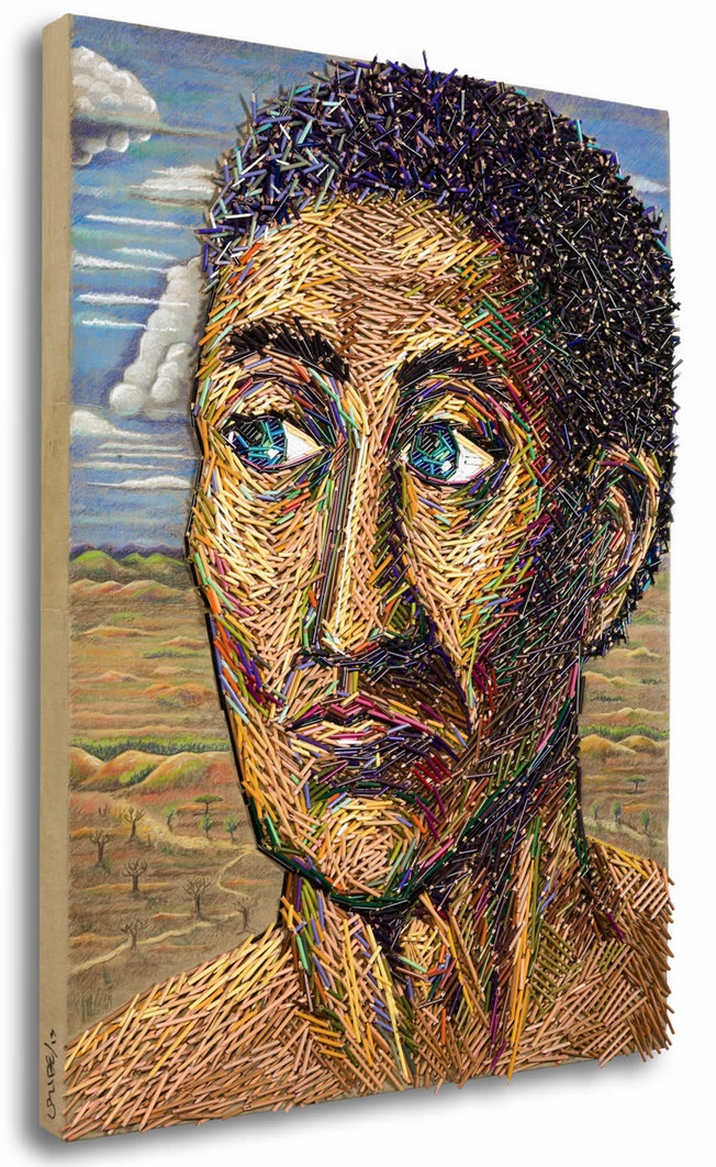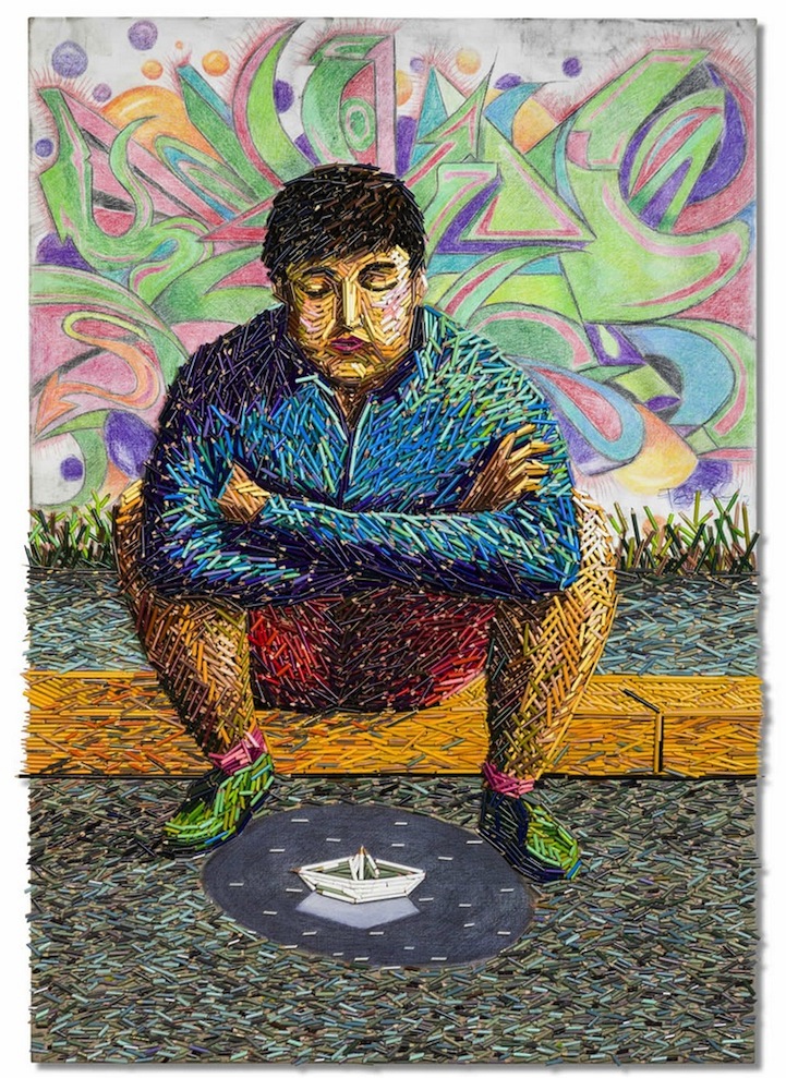 It's safe to say that these aren't your normal colored pencil drawings. Colombia-born, Miami-based conceptual artist Federico Uribe's latest series, called Color Constuido, consists of 20 drawings that are part built with and part drawn by colored pencils. Though the drawings all have a sociological, philosophical or personal story behind them, they're all constructed in a similar fashion. The very same colored pencils Uribe draws with are the ones he also uses in the piece.Therefore, he's mixing two art production techniques – drawing and collage.