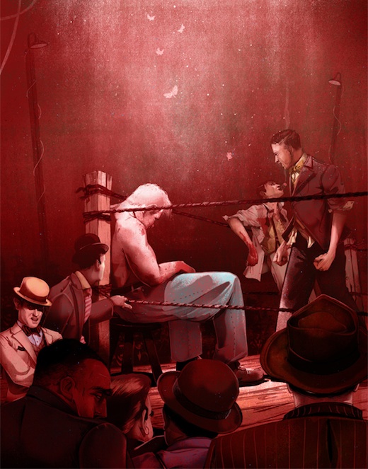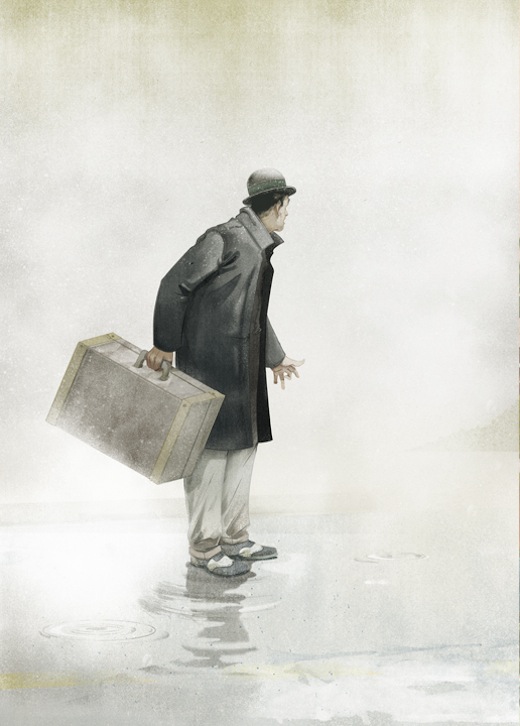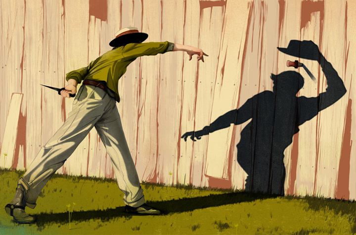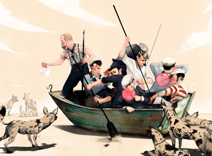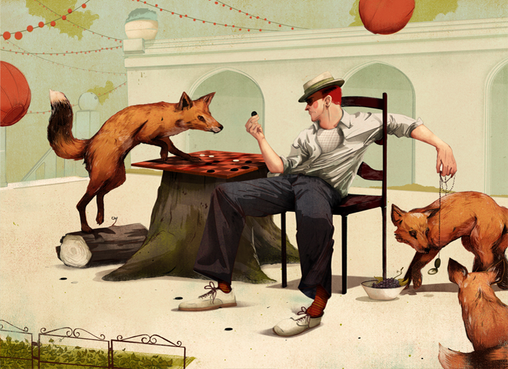 When illustrating, how important is storytelling? The story is everything. I do not believe in a picture for picture's sake. I want to put an idea out there into the world, tell a personal story, present a question, anything that gives the artwork a level past how it looks. I need people to ask ‘why.' When it comes to personal work, things have gotten increasingly complicated as I find myself fantasizing about entire short stories that go into just one image. Funny thing is, it can sometimes work backwards as well. From time to time, I'll make doodles of things I've been thinking about, maybe it's a corn field, or a boxer, or a fox. Then, as I look at this little sketch, a story begins to conjure in my mind. Say it's the boxer. I begin to wonder who is he, what is he doing, where would he be, what is the twist. (I always throw that in there.) Things can really snowball into much bigger ideas than originally planned. I noticed that your work is influenced by Norman Rockwell. What is it about his style that you like? I reference Rockwell often because he is a vivid storyteller. Some people can't stand the (mostly) naive view of the world he painted, but I love it. It's a form of escapism for me. I grew up amongst small towns and wilderness, so in some regards I relate to the visuals. Otherwise, his figures have always been what attracts me. The ability Norman Rockwell has to tell a story or set a mood with a simple gesture or facial expression is incredibly inspiring. Your client list includes The New York Times and The Atlantic. How did you start working with them? Similar to most of my clients, it was with persistence and regular self-promotion that I was able to get in the door with those folks. I was sending work samples for a good two years to both the Times and The Atlantic before I was ever hired! What is the most challenging part of your job and the most rewarding? Challenging: Staying confident when the phone doesn't ring for a few days. Rewarding 1: When the phone DOES ring after a few days. Rewarding 2: I've discovered that a ‘typical Monday morning' when self employed is not nearly as bad as a ‘typical Monday morning' when employed by someone else. Can you name other illustrators that you admire? Admire: Marshall Arisman, David Sandlin, Yuko Shimizu. Besides being incredible artists, these folks have a tremendous passion for what they do and are not afraid to show it. I really respect a person who puts that much heart and soul into something. Each has given me help and perspective on my path to being where I am at this point. What tips would you give to aspiring illustrators? Two things, both very important to me: – The most important thing to remember is that while art is a passion and love, being an illustrator is a business. You are your own product and to sell yourself you must take the business side of things seriously. – I am of the opinion that as a unique individual, an artist should be much more focused on what they are trying to say, not how they are saying it. Don't worry about the style or look of the pictures, worry about the content. When you start channeling yourself through the content, the way you express it will follow its natural course. Jonathan Bartlett