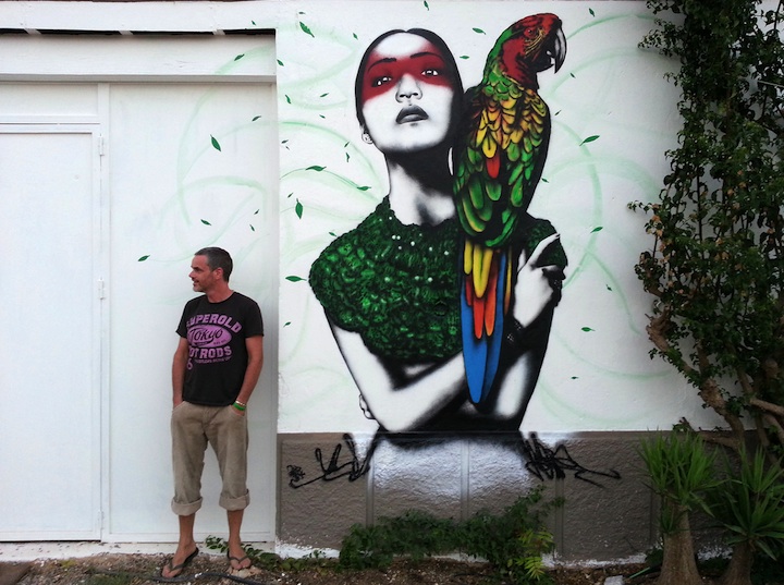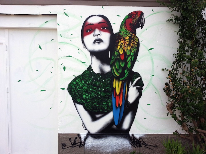 Irish urban artist Fin DAC has just completed this beautiful stencil work in Ibiza, Spain for the Urban In Ibiza festival. Called Alabaster at Nagai, it shows a gorgeous woman with a colorful parrot on her shoulder. (Also, notice the tiny green leaves or feathers surrounding them.) The artist, whose work we've featured a number of times on My Modern Met (see here and here) is known for creating these types of stunning murals. As he says, “In a short career, I have defined and perfected a paint style that ignores the accepted visual language of street art… I call it Urban Aesthetics – a modern-day take on the 19th century art movement.”