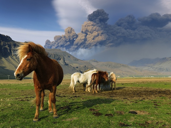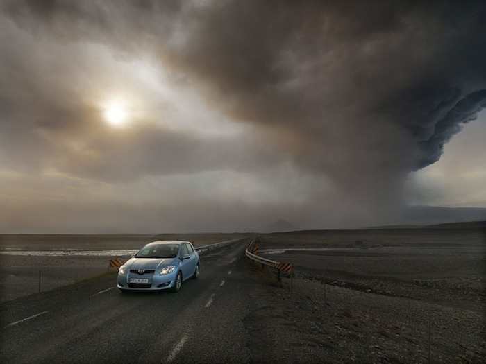 While most saw the natural disaster as a huge inconvenience, Swedish landscape and aerial photographer Hans Strand saw it as an opportunity. Though it took him seven attempts before he found a way to fly to Iceland, his persistence paid off as he shot the volcano within 600 meters flying in a Cessna 172. Strand was one of the few who was able to witness, first-hand, the “continuous explosions and huge bursts of lava shooting into the sky.” He also shot from the ground, photographing the ash cloud's dramatic background against the tranquil Icelandic landscape.