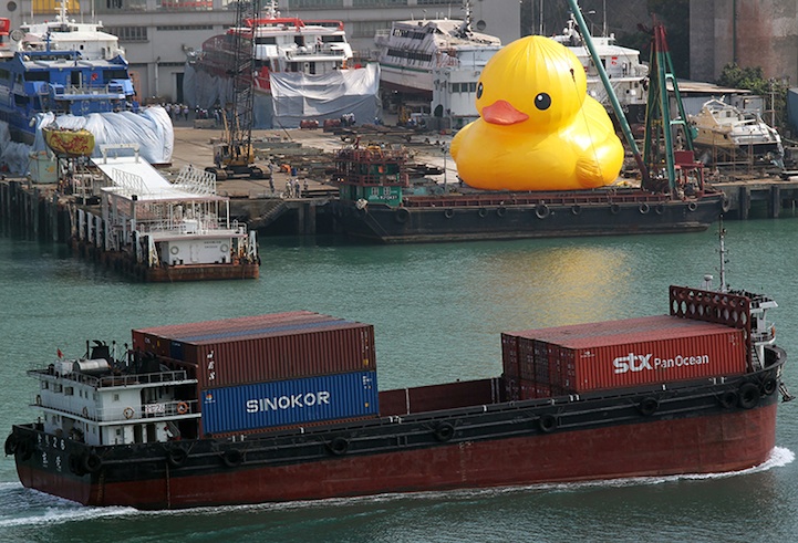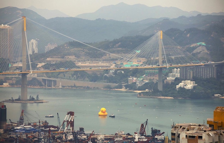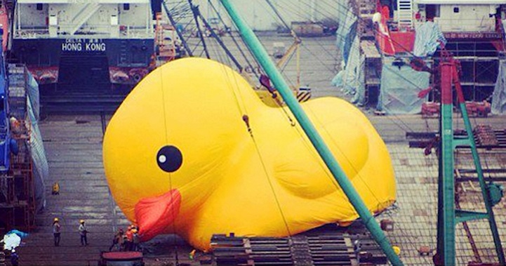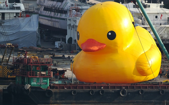 On May 2nd, Dutch artist Florentijn Hofman's huge inflatable sculpture, called Rubber Duck, will officially debut, sailing into Victoria Harbour in Hong Kong. Already, it's been causing quite a stir as curious locals have watched it inflate in a shipyard in Tsing Yi. Hofman's famous duck has floated in waters around the world, in cities like Sydney, Osaka, and Sao Paolo, but this is the very first time it has ever been in Hong Kong.