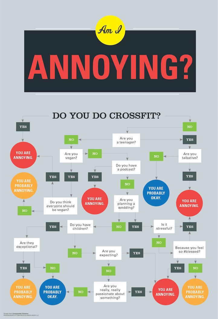 In Knock Knock’s new book, Consequential Dilemmas: 45 Flowcharts for Life’s Bigger Questions (the much-anticipated sequel to Inconsequential Dilemmas: 45 Flowcharts for Life’s Peskier Questions), the flowchart finally gets a much-needed makeover. Find out if you’re annoying (hint: bad news if you do CrossFit or consider yourself #blessed), discover if you’re destined to become a crazy cat lady, and get a second opinion on whether you should really send that break-up text. (You probably shouldn’t.)