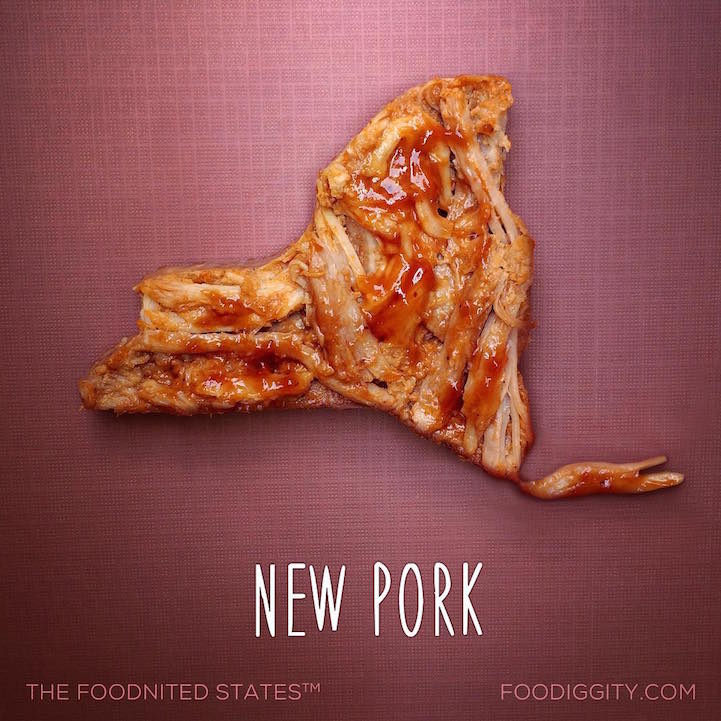 We marked the halfway point of this project earlier this year. Today, Chris and his son have officially completed this extraordinary project with their final state–New Pork (the concrete jungle where dreams are made of… pork). “When my son, Cameron, came to me with the idea for ‘States made out of food,'” Chris explains, “it was his idea of ‘New Pork' that got the ball rolling. So, although this is the last State in the series, it was the first that had a name, and was the inspiration for the entire project.”