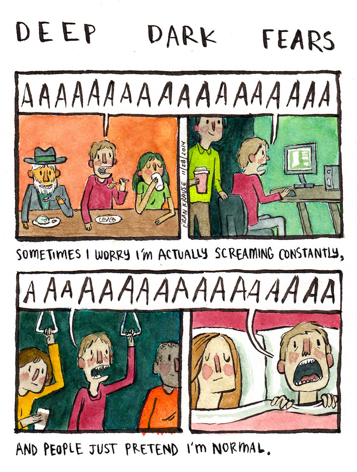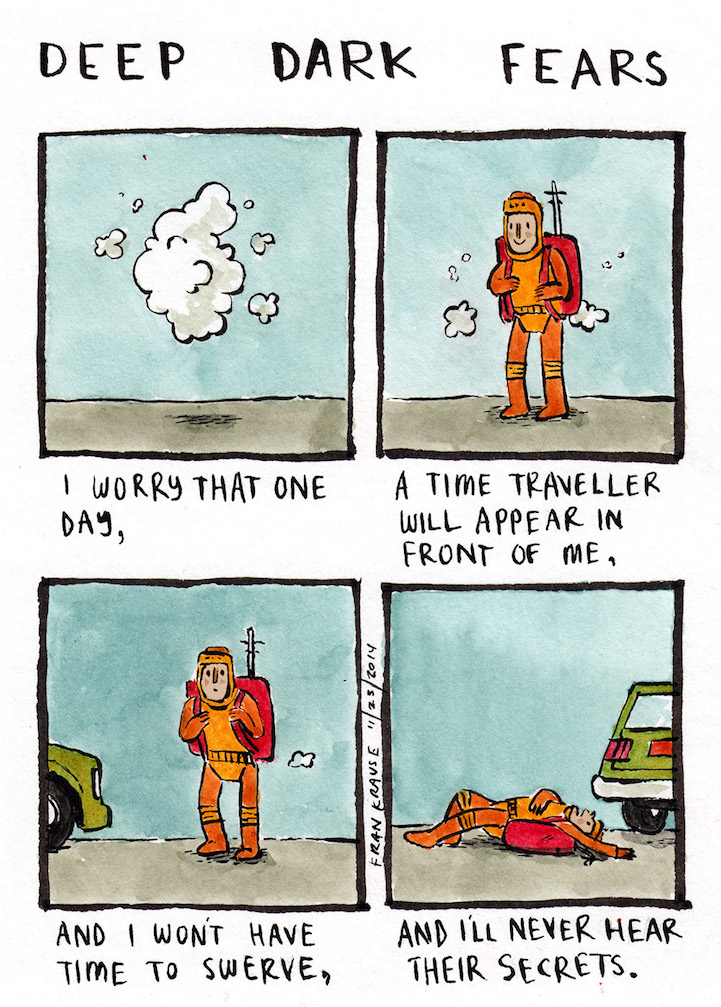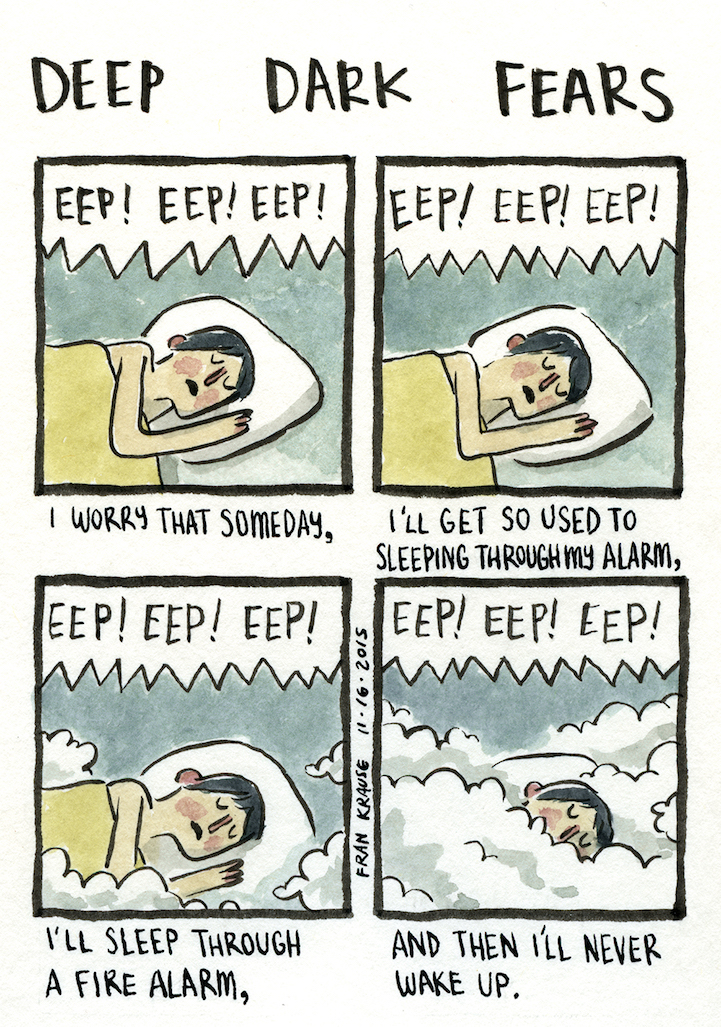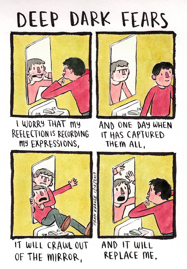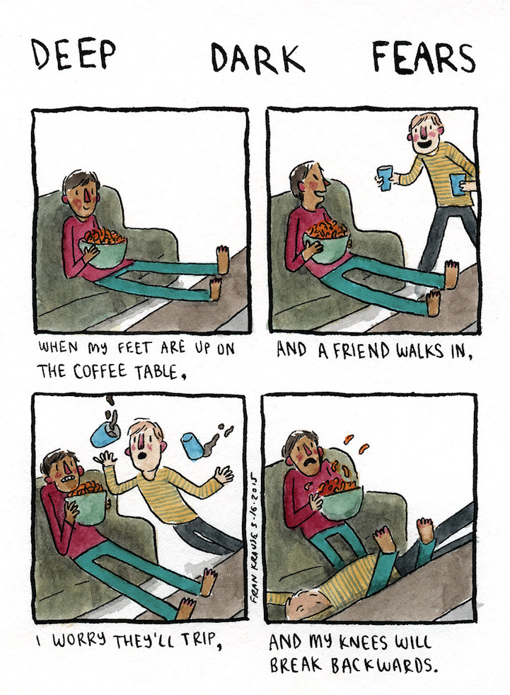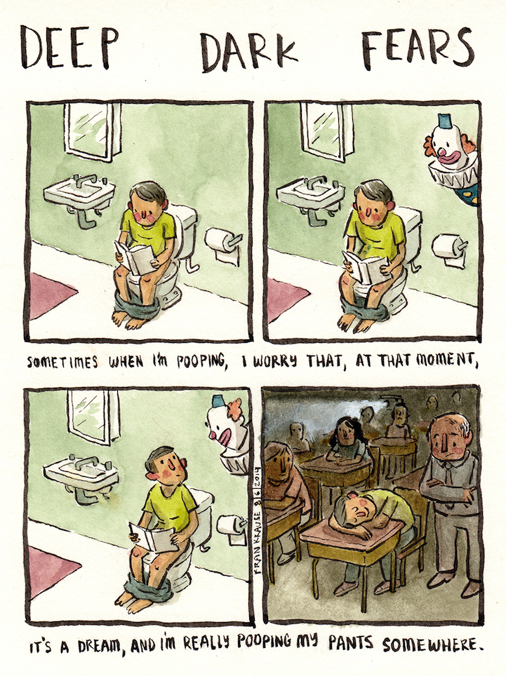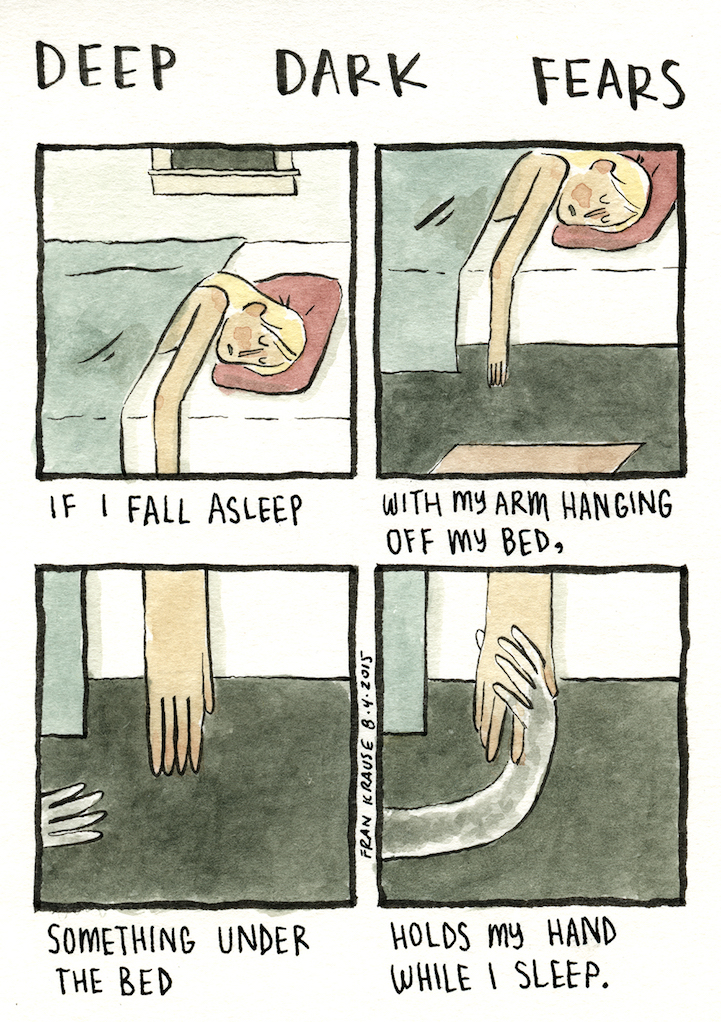 Fear is an emotion that all people experience, though it's easy to feel alone in your panic as your nightmares are getting the best of you. Whether it's a certain predator with scales, sharp teeth, and talons; creepy, crawly spiders; clowns who only pretend to be your friend; or a monster in your closet, we all have particular phobias that keep us up late at night. To show the world that we're never alone in such fears, artist Fran Krause created Deep Dark Fears–a web comic that illustrates others' sometimes humorous, sometimes gory, and mostly downright relatable fears.