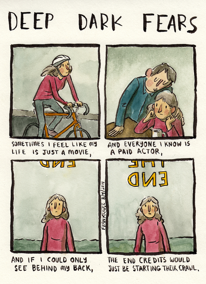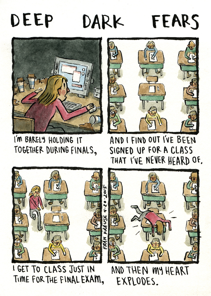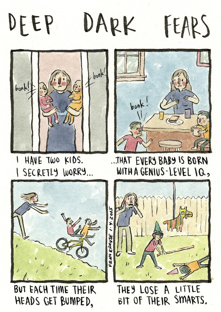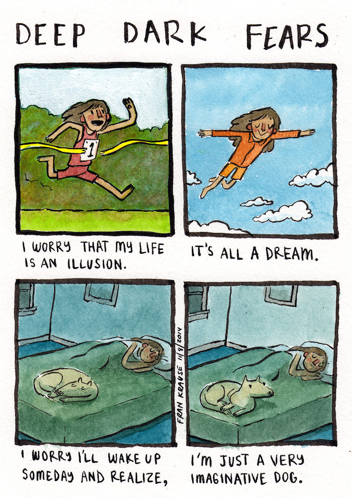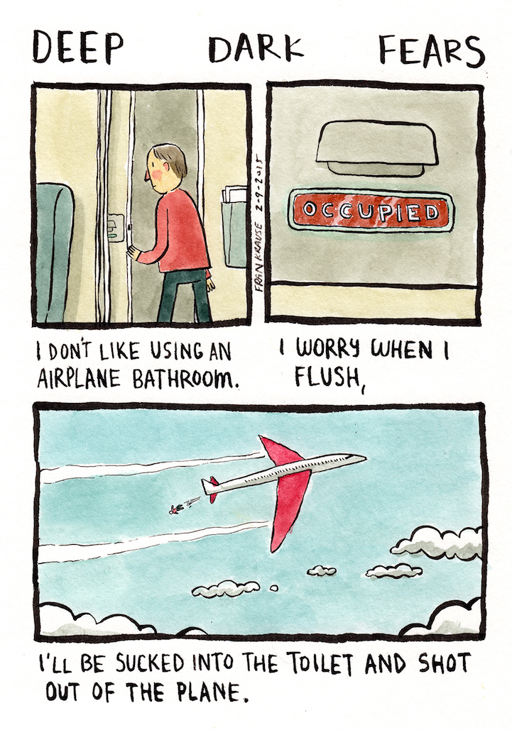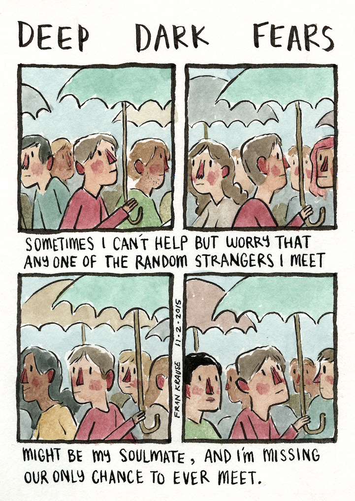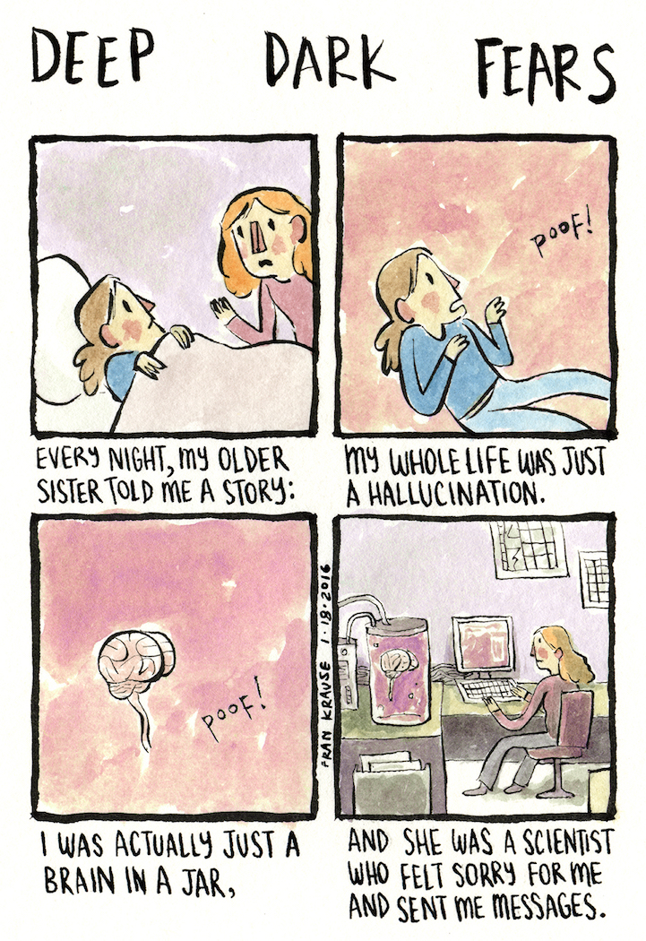 Fear is an emotion that all people experience, though it's easy to feel alone in your panic as your nightmares are getting the best of you. Whether it's a certain predator with scales, sharp teeth, and talons; creepy, crawly spiders; clowns who only pretend to be your friend; or a monster in your closet, we all have particular phobias that keep us up late at night. To show the world that we're never alone in such fears, artist Fran Krause created Deep Dark Fears–a web comic that illustrates others' sometimes humorous, sometimes gory, and mostly downright relatable fears.