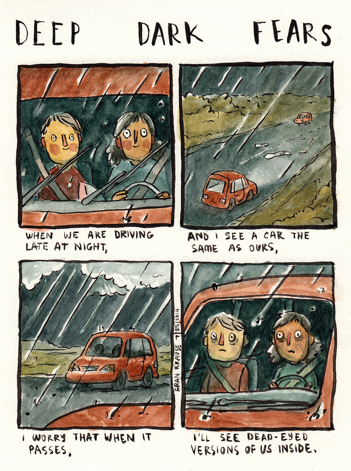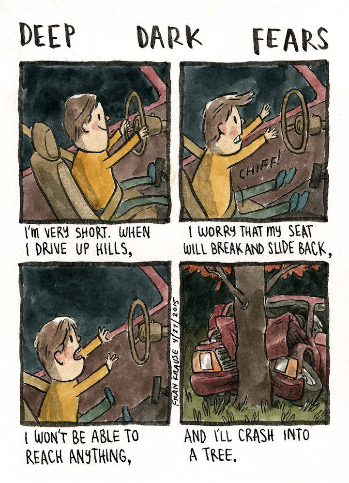 To help others get their fears out of their heads in a creative fashion, Krause developed an online submission form for readers who would like their deepest, darkest fears illustrated. Thanks to his success with this endeavor, the artist was able to produce a Deep Dark Fears book featuring 101 comics that are sure to make you feel less alone when a horror movie-type idea suddenly emerges in your mind.