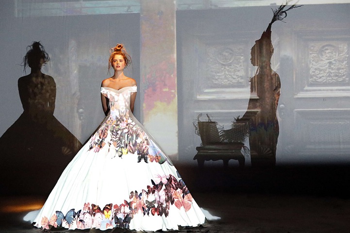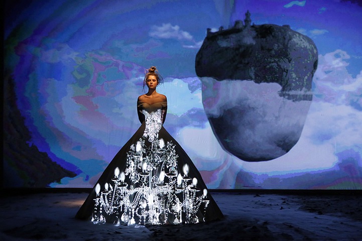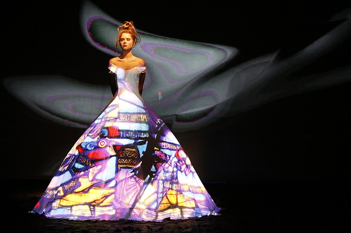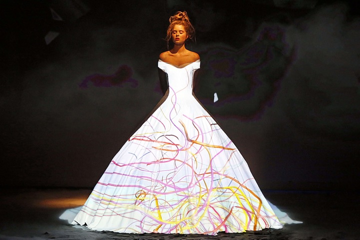 Could this be the future of fashion? French fashion designer Franck Sorbier unveiled his latest collection of haute couture for the Fall/Winter 2012-2013 that features a seamless (no pun intended) blend of fashion and technology. The designer's new line of works consisted of only two models – one in a black, fitted dress with an elaborate, pointy hat and the other with a simple, white ball gown. While it may sound unusual for a high-fashion show to consist of only two clothing pieces, the white garment actually served as a canvas for projections, transforming the ensemble into numerous outfits.