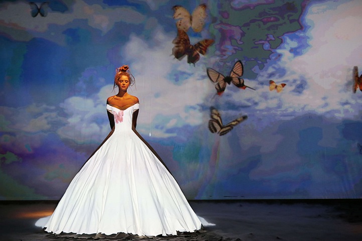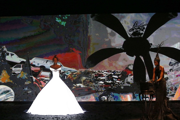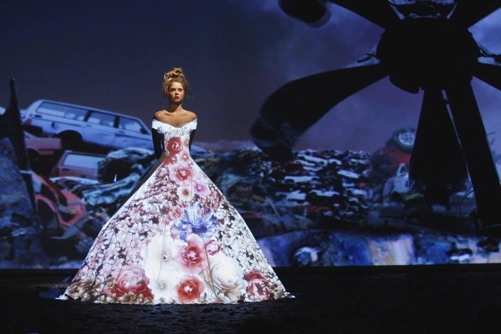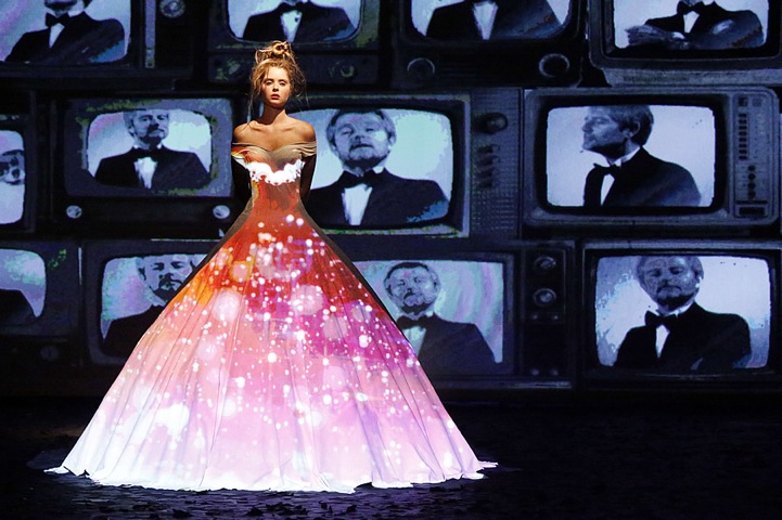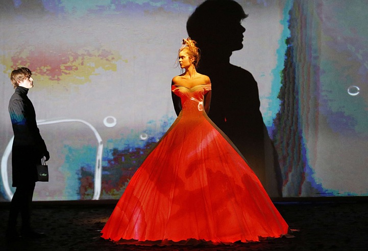 Sorbier's fashion show turns the impossible into reality with the stunning visual effects projected both on the backdrop and, of course, the gorgeous gown. Be sure to check out the video, below, that shows the brilliantly multi-patterned and animated dress in action.