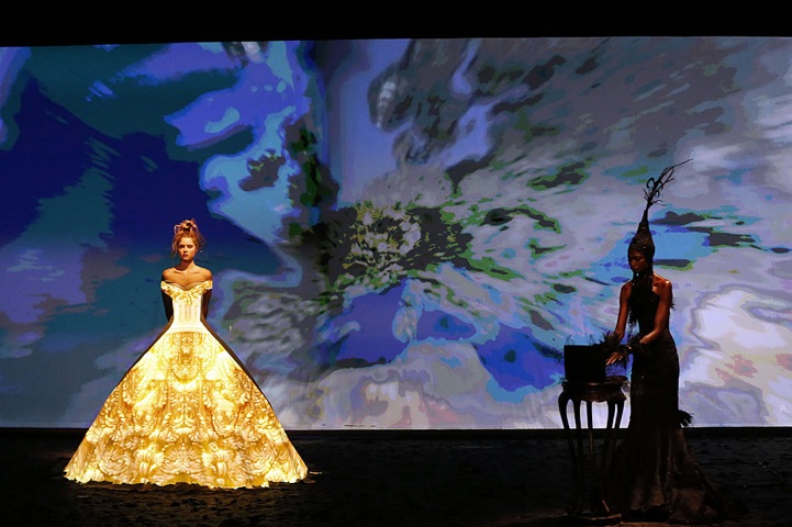 Sorbier's inspired display was as much a fashion show as it was a piece of performance art or a theatrical light installation. The presentation followed the dark fairy tale of Donkeyskin, which entails the story of a king, a grieving widower, who has promised his late wife that he shall only remarry a woman of equal beauty, which turns out to be his daughter. In an effort to avoid the marriage, the princess seeks the guidance of a fairy godmother who advises her to request the impossible – gowns that are the color of the sky, as bright as the sun, and the color of the moon.