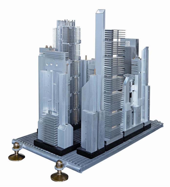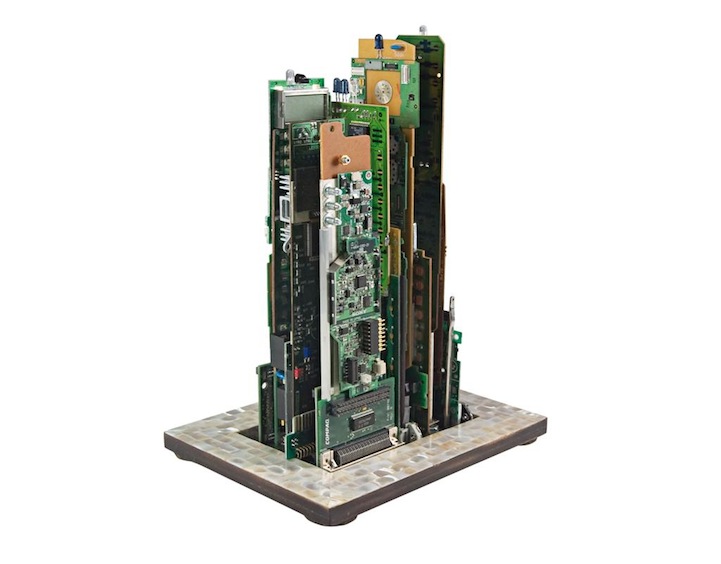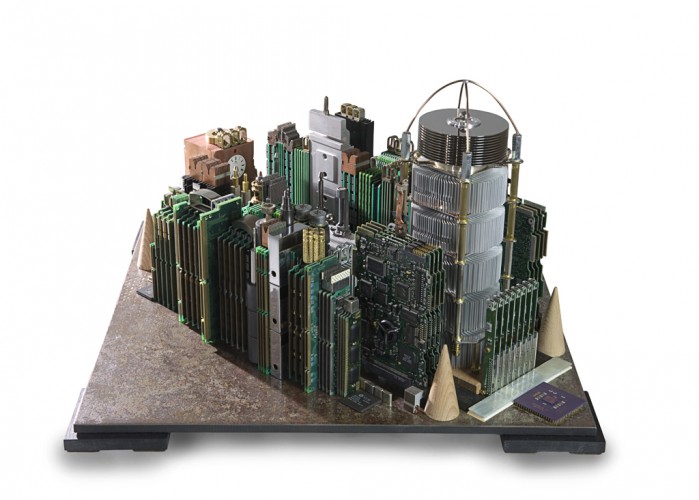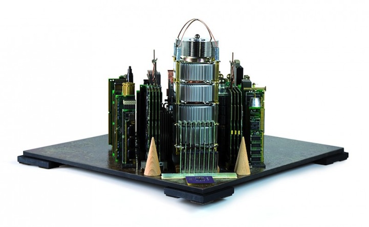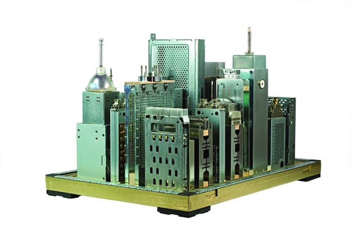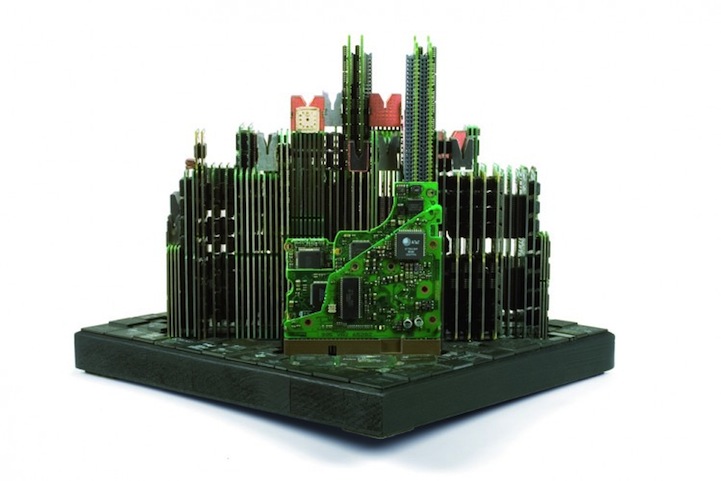 Italian artist Franco Recchia puts old computer parts and the inner components of various technology to use for the production of his architectural sculptures that mimic urban landscapes. From motherboards and hard drives to radiator parts and metal scraps, Recchia repurposes the discarded materials, transforming the mere bits of tech junk into model urban landscapes, paying homage to the modern metropolises of the world.