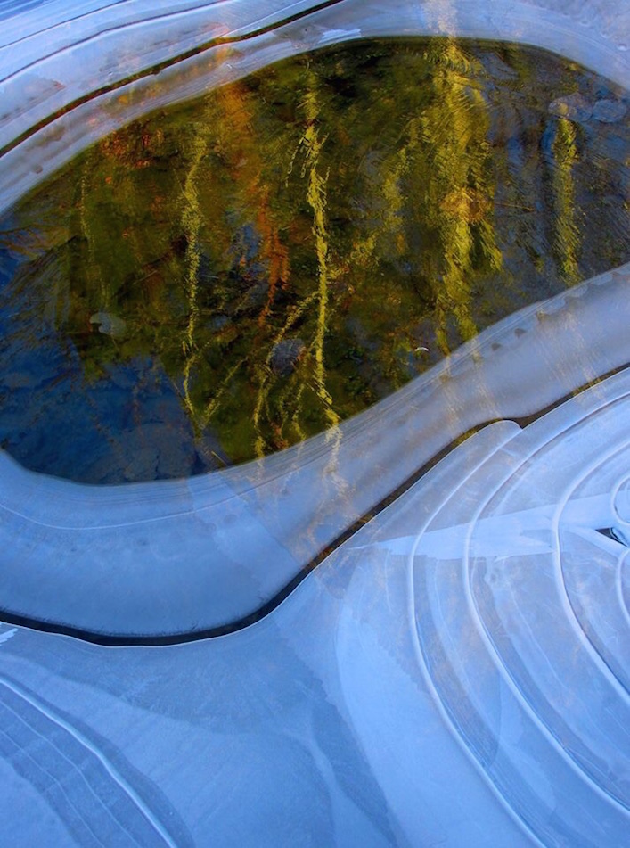 Bold white “outlines” highlight different shapes in the ice, and they trace around rocks that stick out of the pond. There are brilliant, multifaceted colors and crystals that are visible depending on your vantage point. And, when photographed up close, the pond sometimes resembles an abstract work of art rather than frozen water.